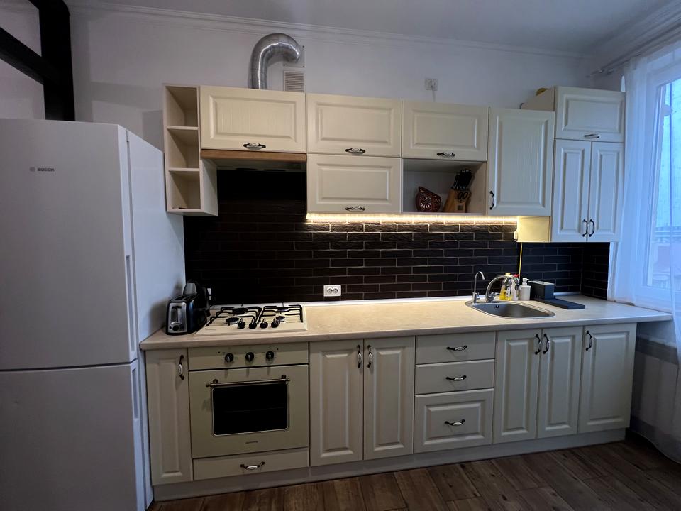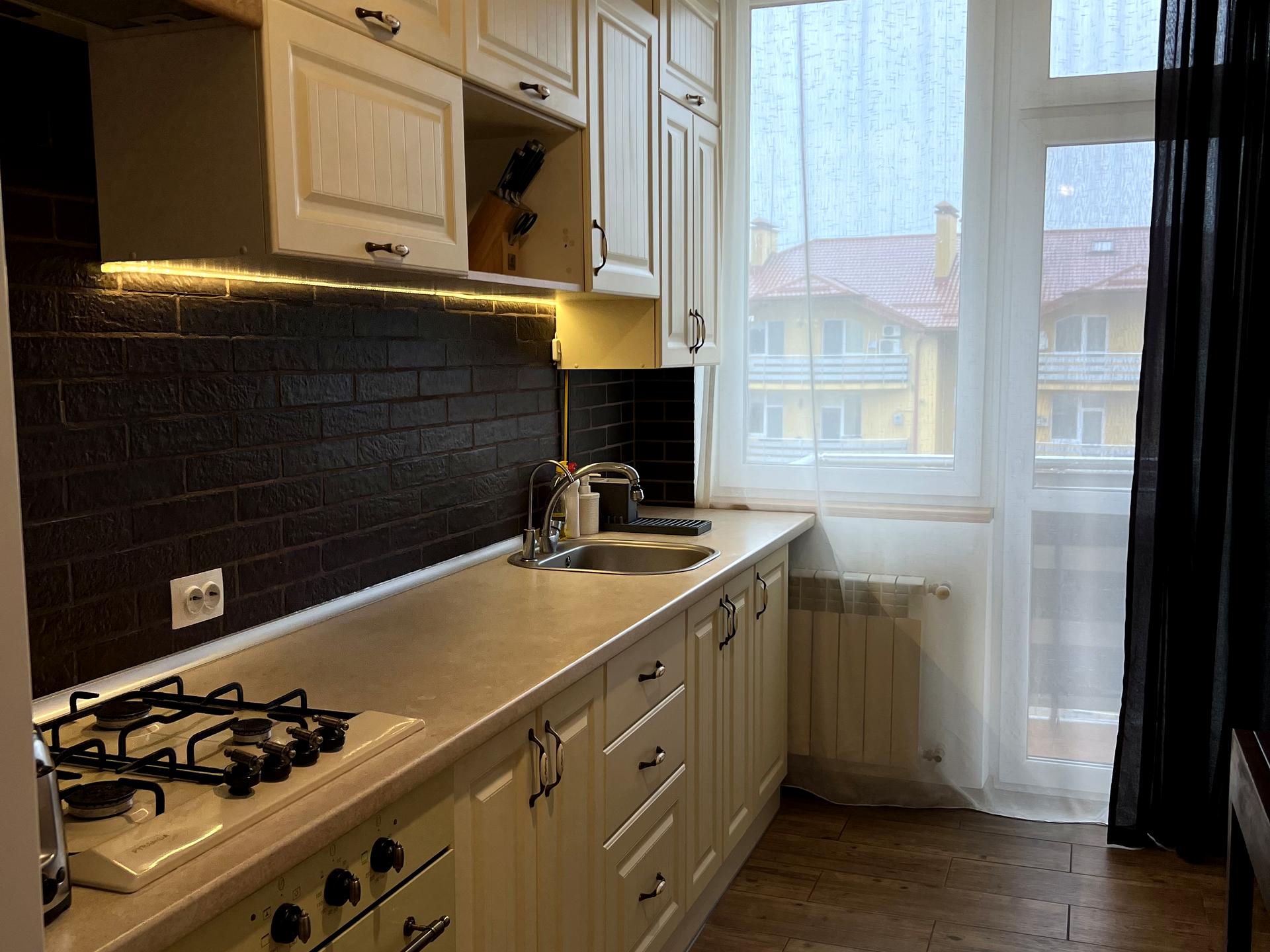 Затишна квартира після оновленого косметичного ремонту. Простора кухня, завдяки обʼєднанню з коридором, є місце для гостей, а також відпочинкова зона. З кухні можна вийти на балкон, так само із спальні, де є маленька тераса. Велика спальня з розкладним диваном та виходом на балкон. Є кондиціонер та телевізор. В спальні розміщена велика шафа. В квартирі багато поличок, для речей, а також декору.