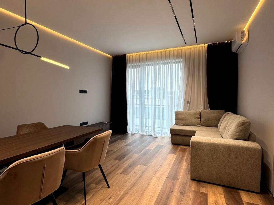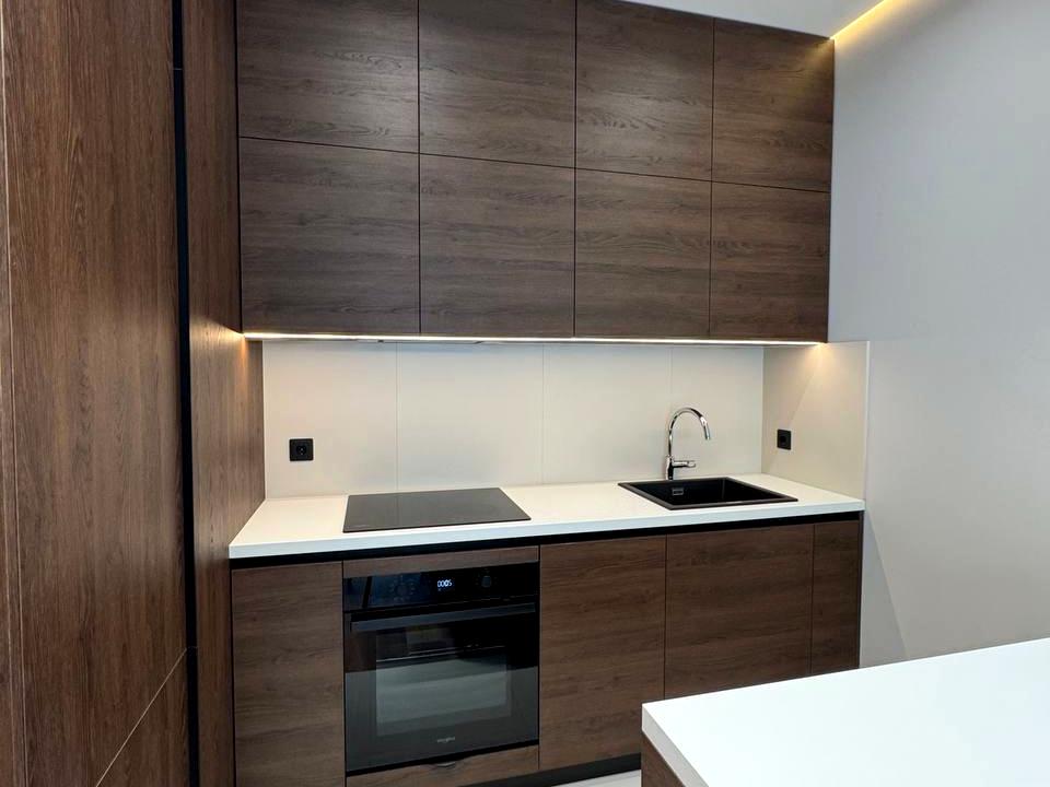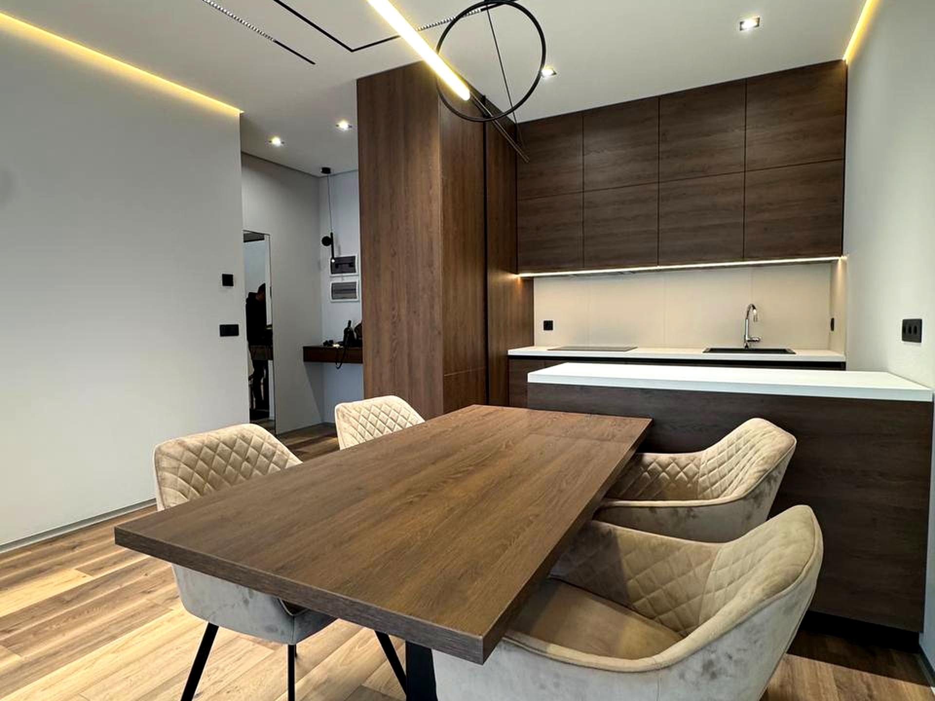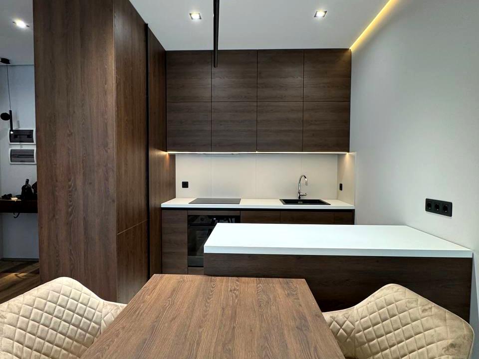 Виконаний дизайнерський ремонт у сучасній мінімалістичній стилістиці: теплі відтінки дерева, продумане зонування, якісне освітлення, вбудована кухня та обідня зона, що виглядає естетично й цілісно.