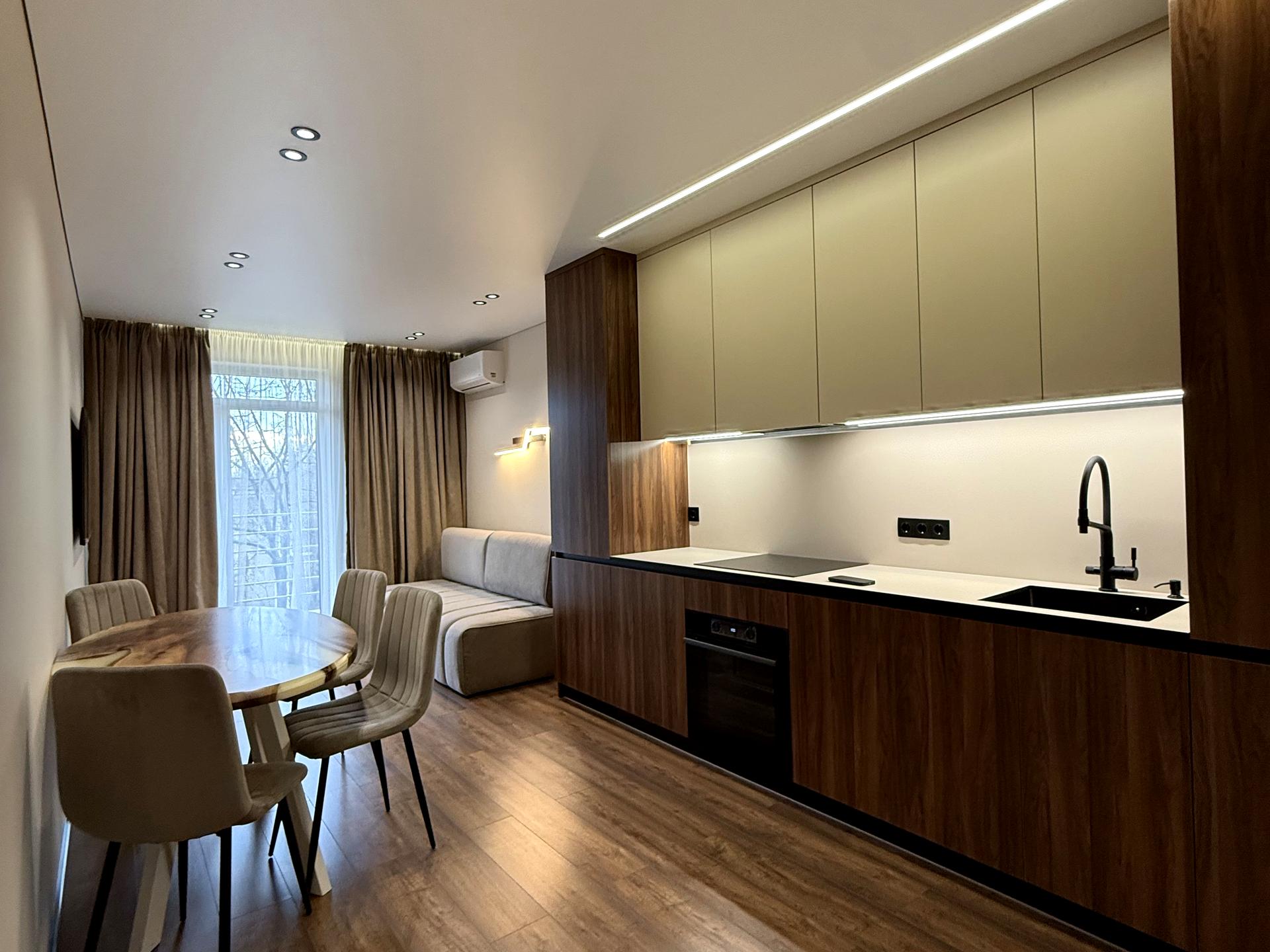 В квартире 1 комната, высота потолков 2.8 метра, Технологія будівництва - Монолітно-каркасна, Тип будинку - Спец. проект. Газа нет, кухонная плита электрическая. Есть балкон. В квартире есть Телевизор, Подогрев полов, Кондиционер, Стиральная машина, Сушильная машина, Душевая кабина, Холодильник, Микроволновка, Посудомойная машина. Общее состояние квартиры - С ремонтом. Горячая вода - электрический бойлер. Количество санузлов: 1. Интернет оптоволоконный. Тип кухни - кухня-студия. Количество спален: 1. Комиссия за услуги 2 %