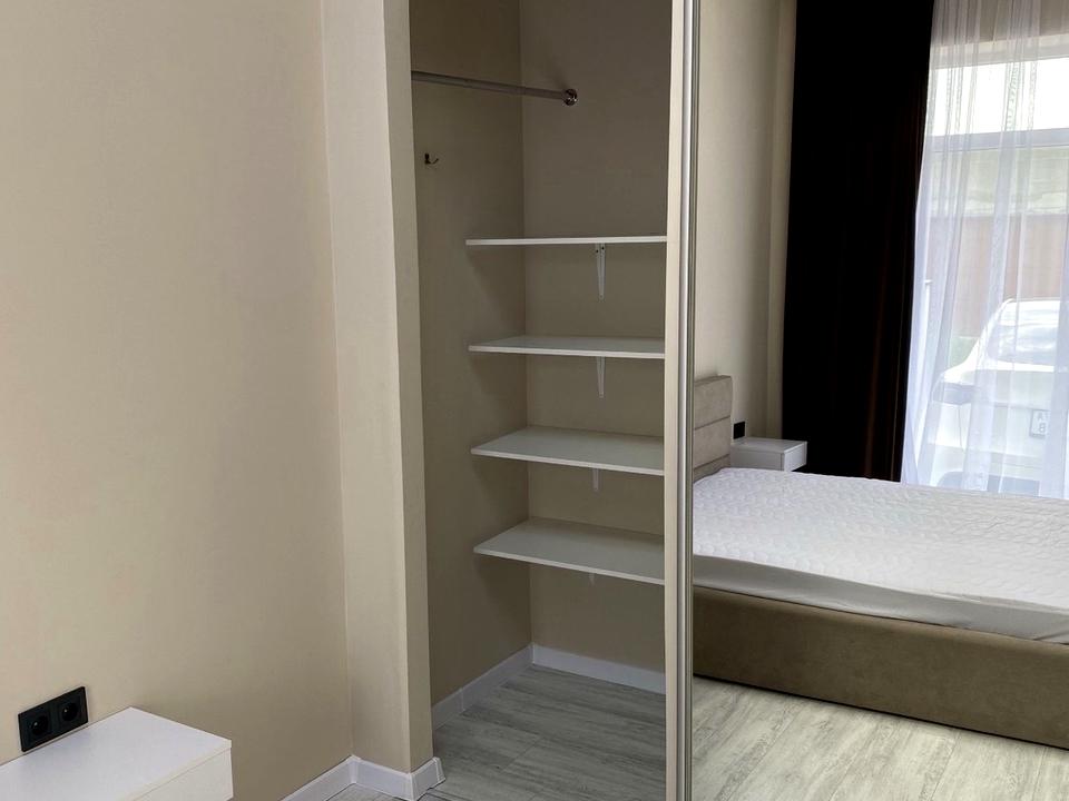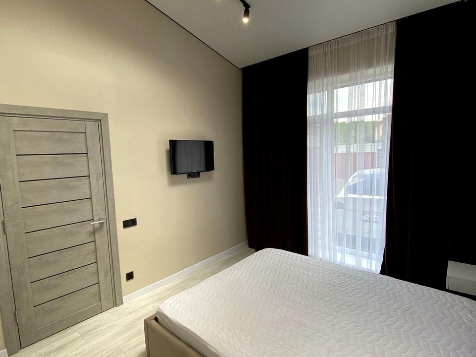 Окрема спальня з великим ліжком + кухня-студія з розкладним диваном.