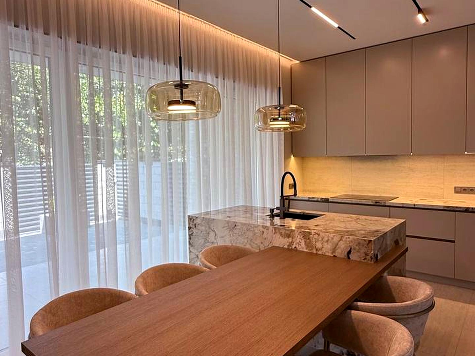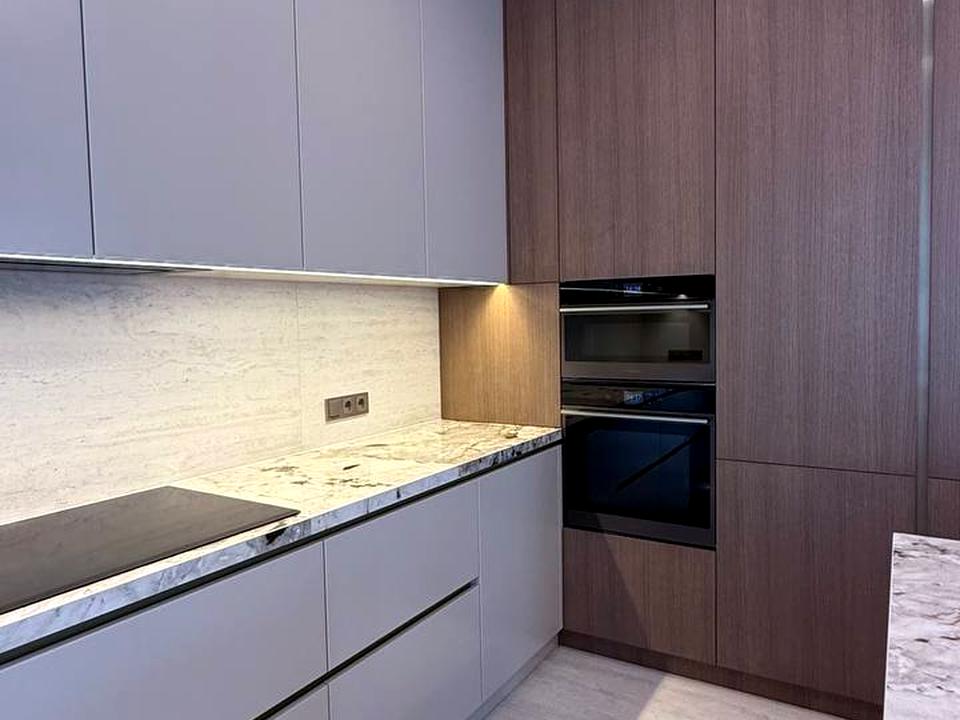 • Вся побутова техніка вбудована (холодильники, морозильники, духовка з Wi-Fi, мікрохвильова, посудомийна, подрібнювач відходів)