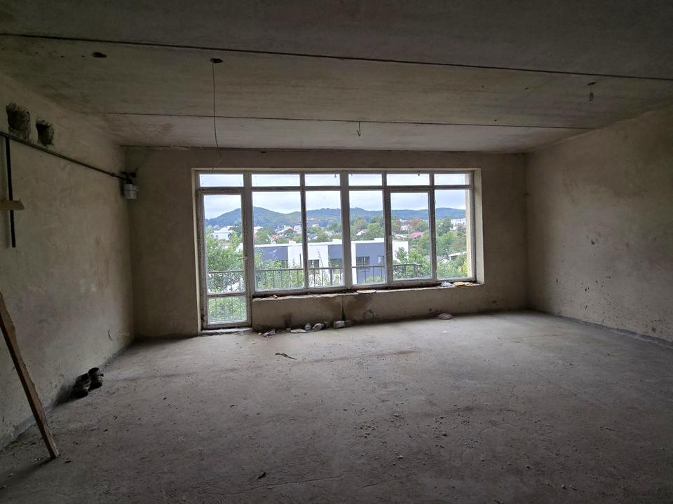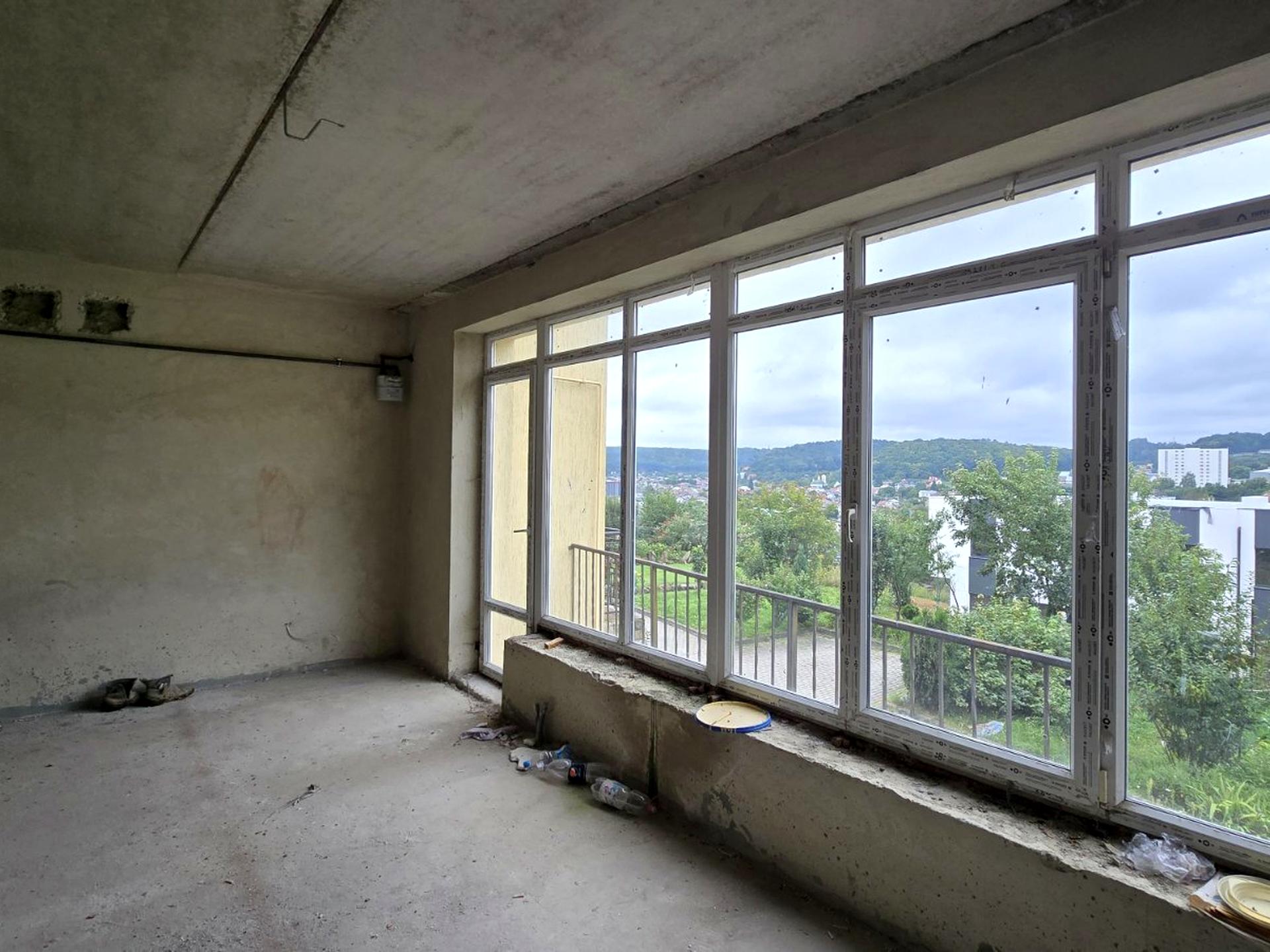 простора кухня-вітальня з панорамним видом на місто ;