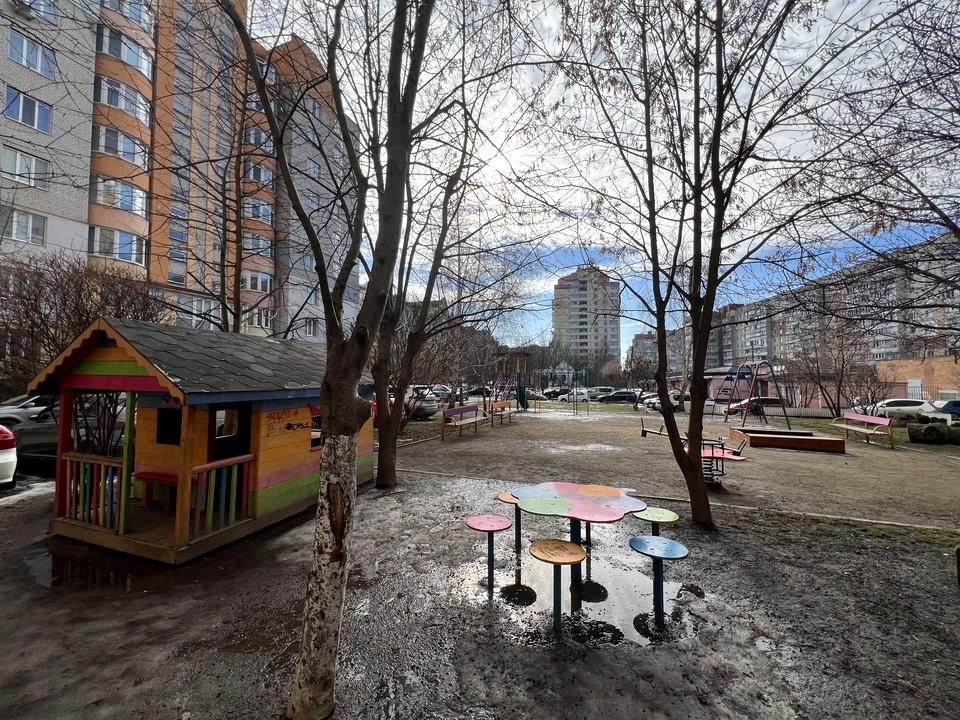 Закритий дитячий майданчик й футбольне поле у дворі.