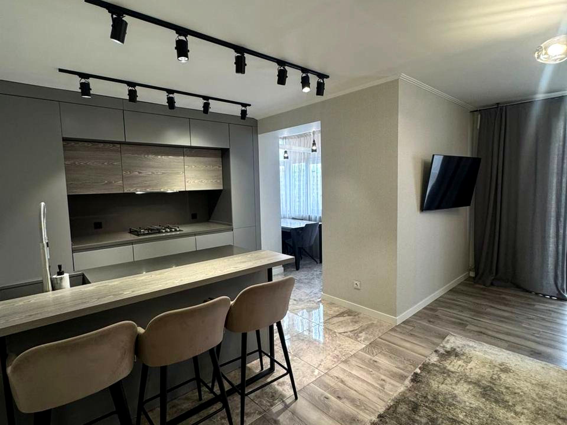 Простора квартира загальною площею 120м2, кухня-студія 49м2. Всі меблі та техніка, які є на фото, залишаються. Підлога: ламінат, плитка, тепла підлога.