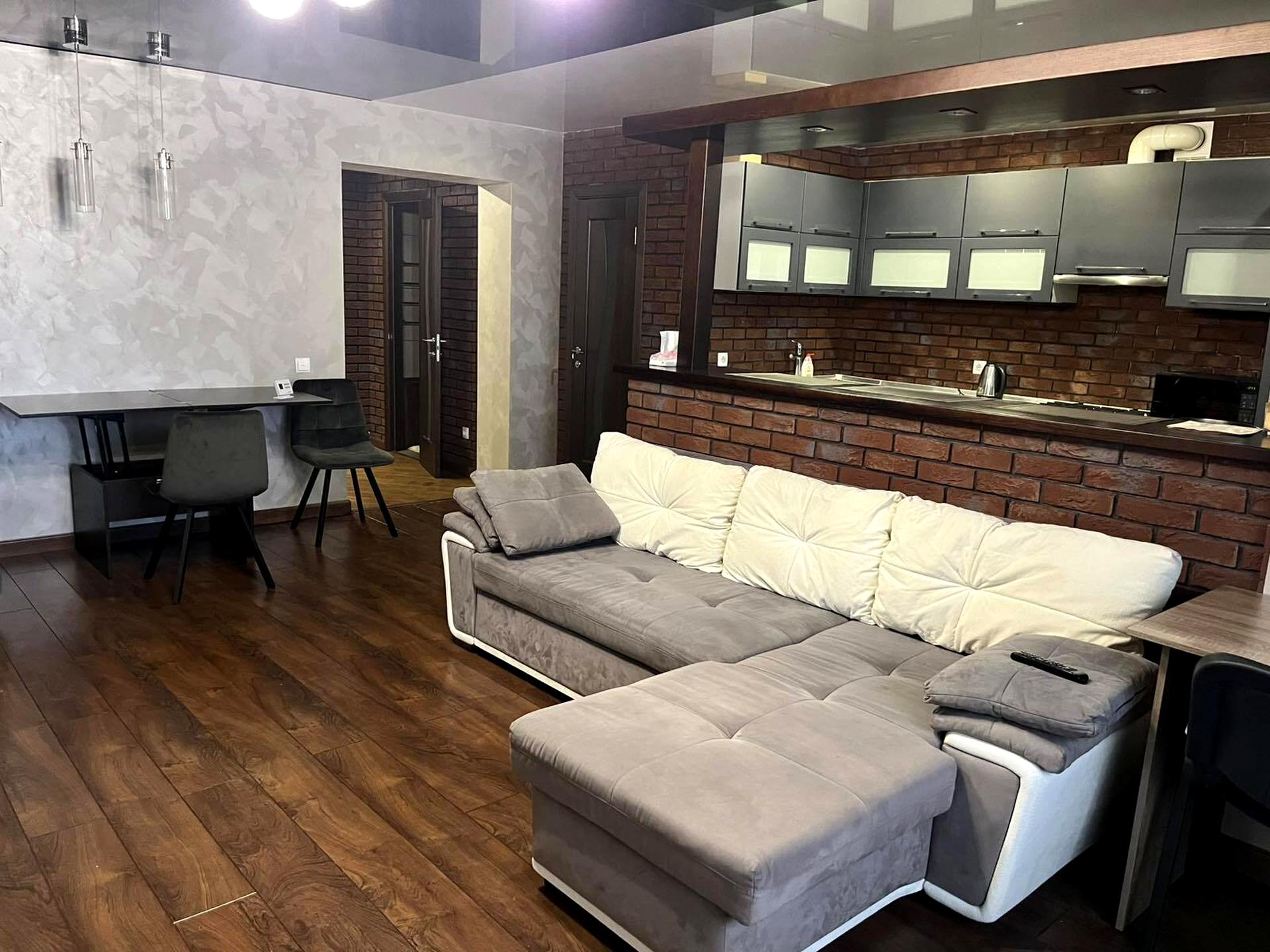 Стиль лофт + сучасна класика: цегляні акценти, теплі відтінки, якісні матеріали, продумане освітлення.