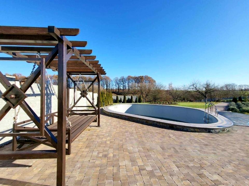 Ділянка 60 соток, з молодим і старим садом. Поруч протікає річка. На ділянці господарче приміщення з гаражем, гранітним підвалом та терасою. Всі ворота на автоматах. Двір навесні викладений тротуарною плиткою.