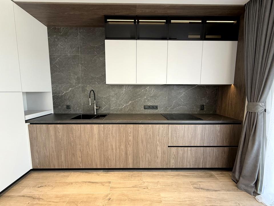 Простора кухня-вітальня з панорамними вікнами, вбудованими меблями та якісною технікою. Поєднання натуральних текстур, дерева й глибоких акцентів створює атмосферу статусу та затишку.