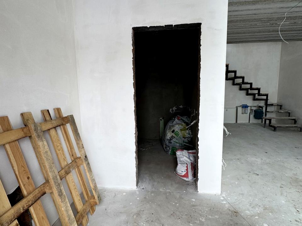Виконано розведення електрики, води та каналізації, встановлена інсталяція, стяжка, тепла підлога, утеплена стеля, радіатори. Зручне планування: кухня-вітальня, дві кімнати, два санвузли.