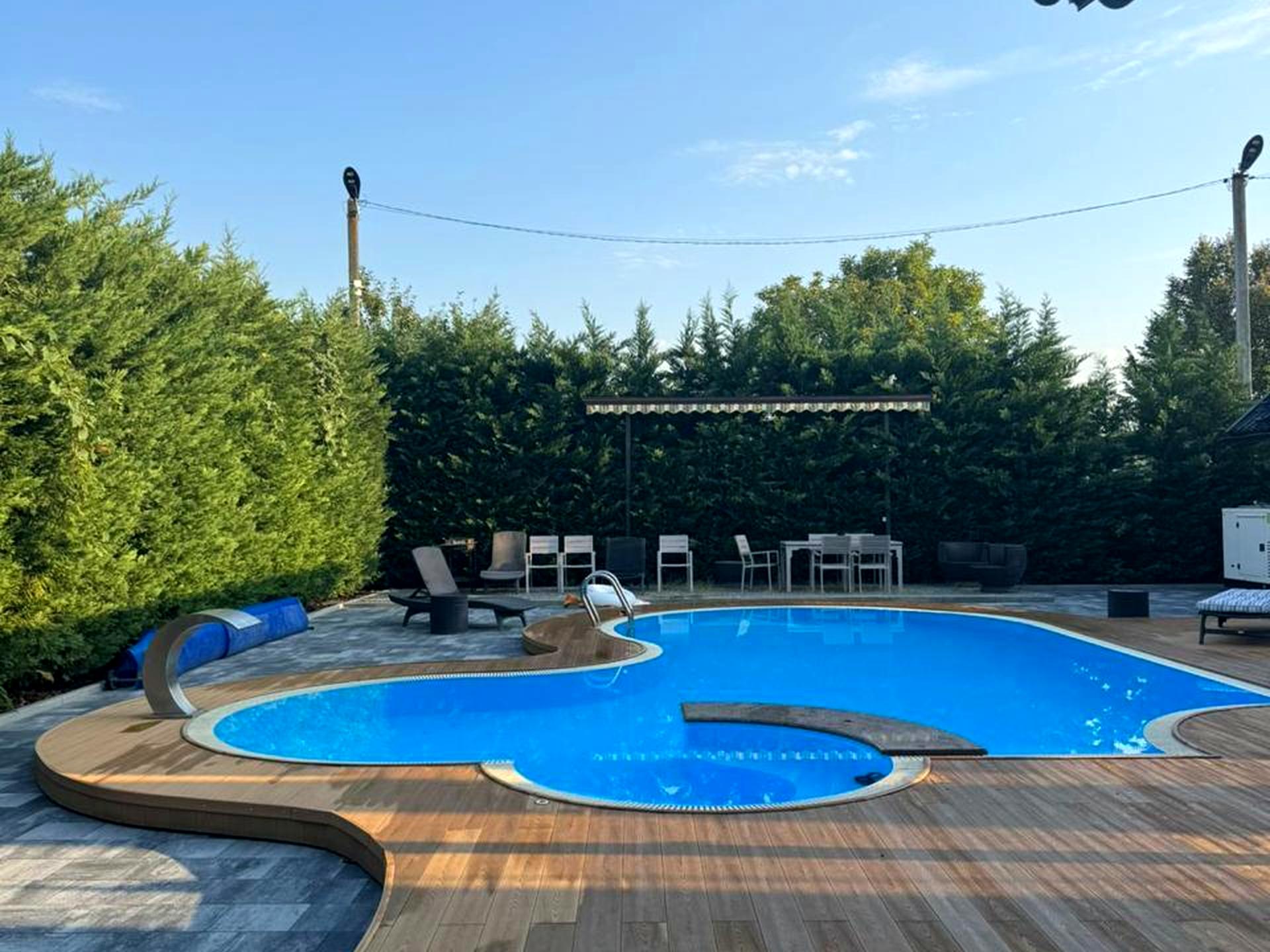 Комунікації: центральний водопровід, центральна каналізація, газ, електрика, швидкісний інтернет. На території басейн з підігрівом, альтанка, барбекю-зона, автоматичні ворота, господарські будівлі.