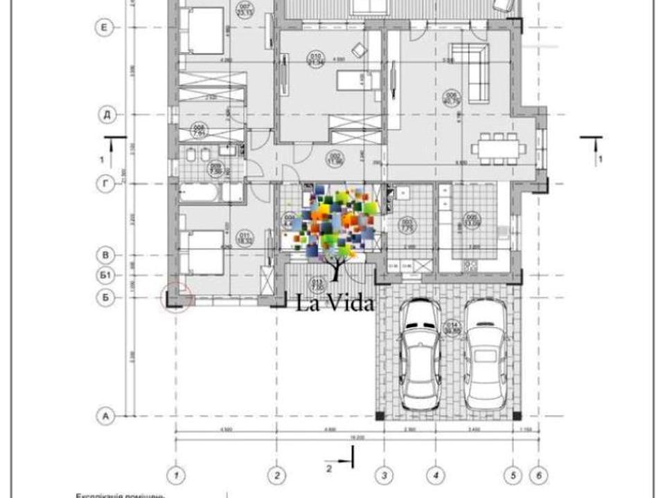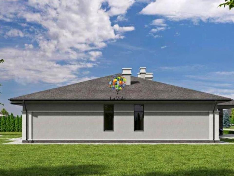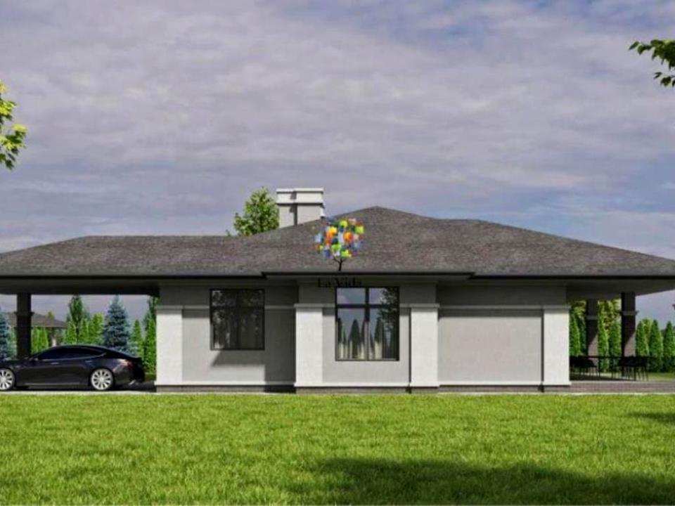Також простора крита тераса, та навіс для двох автомобілів. Завдяки грамотному зонуванню, в котеджі відділена зона відпочинку, спальні та великий санвузол знаходяться далеко від загальної зони вітальні, їдальні та кухні. Це дозволить кожному члену сім'ї мати свій простір, не заважаючи іншим.