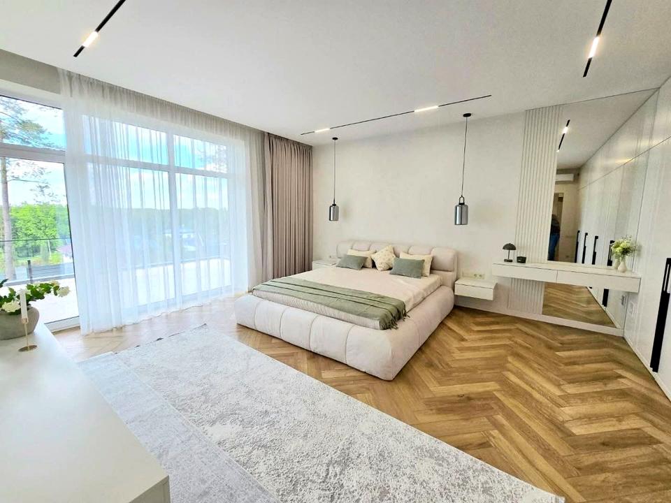 2 поверх 3 спальні, 2 санвузли, пральня, 3 гардеробні, верхня тераса, вихід на горище, горище 50 м2 додатково. Головна спальня зі своїм сан вузлом, гардеробною, виходом на терасу та додатково великою шафою. Штори електроні.