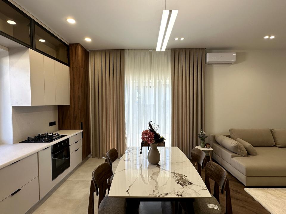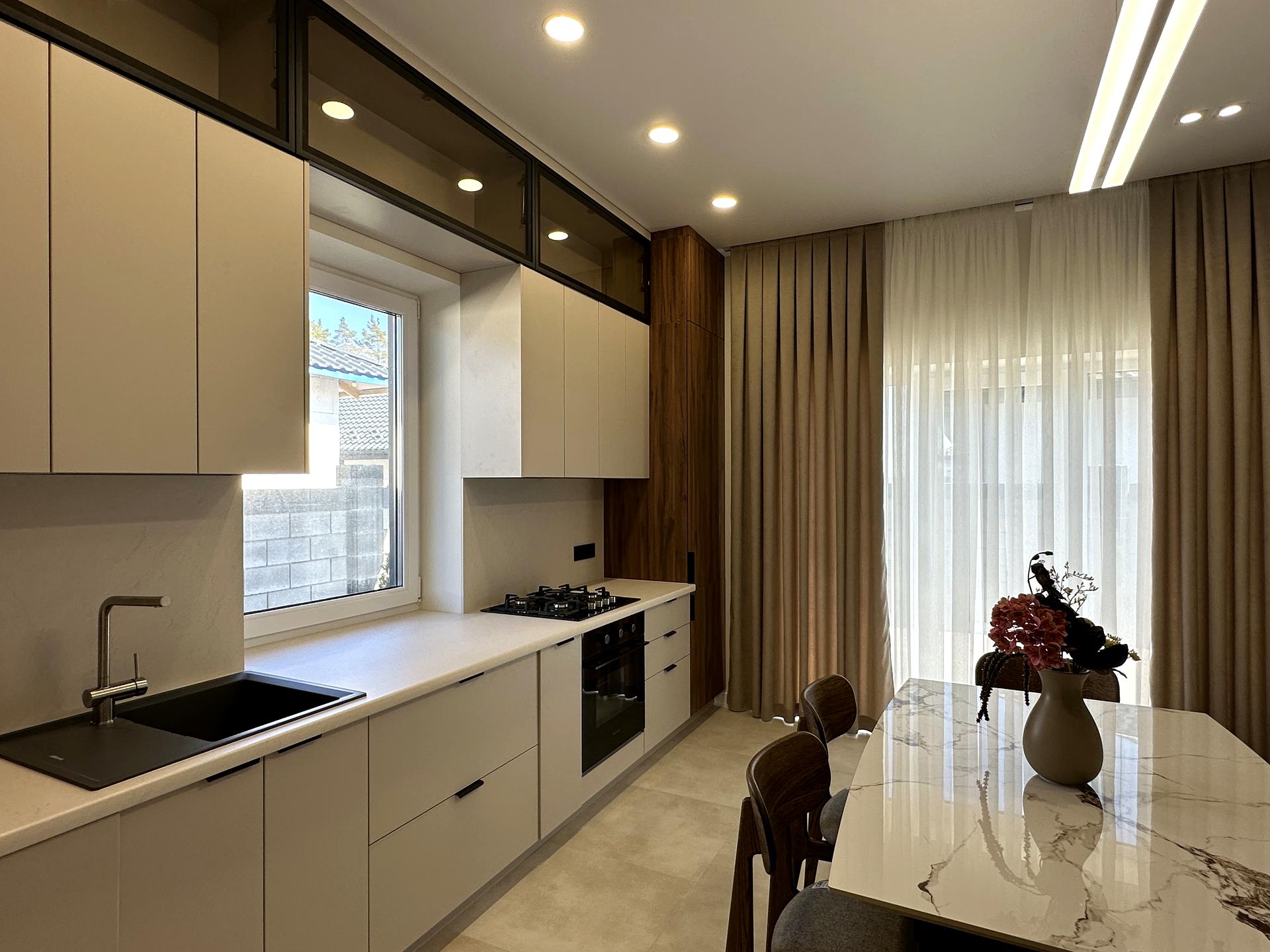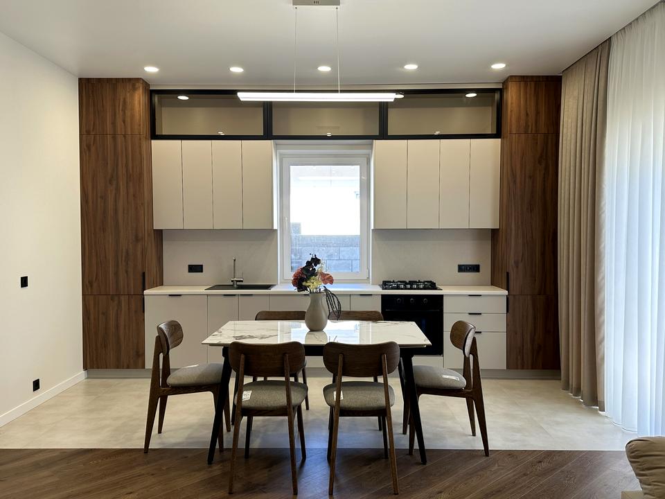 Встановлена вбудована шафа при вході, у кухні вітальні велика кухня з усією необхідною вбудованою технікою (холодильник, посудомийна машина, газова плита та витяжка), великий диван та обідня група.