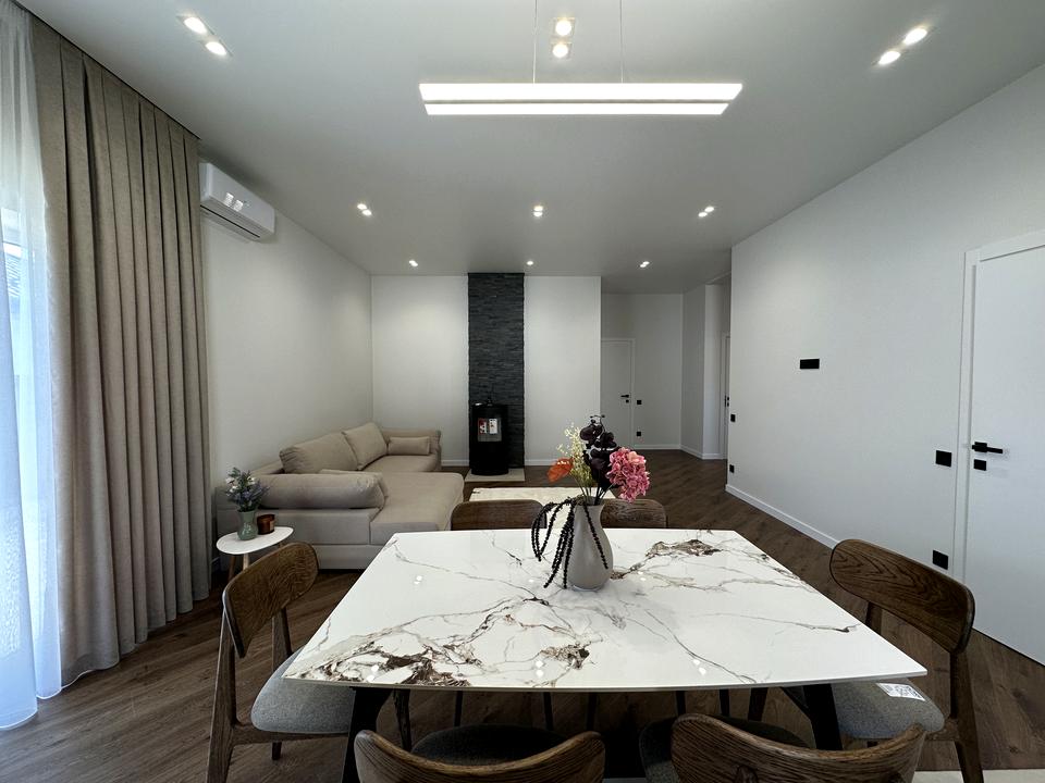 В кухні-вітальні облаштований димоходний камін. Вже встановлені світильники та люстри з різними сценаріями освітлення.