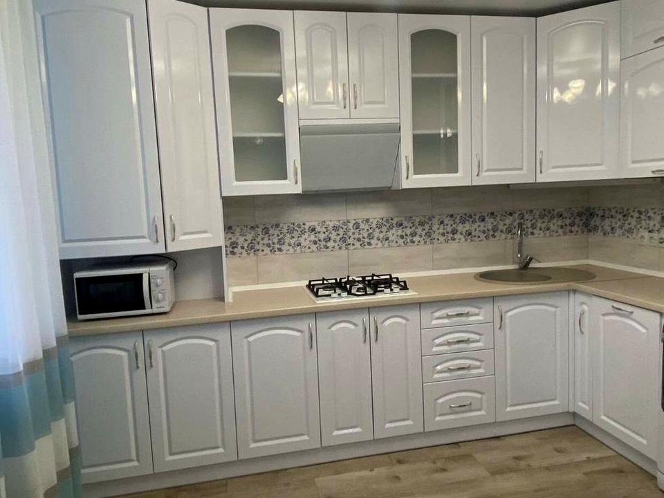 • Простора кухня, де панує ніжність блакитних відтінків, створюючи особливий затишок для сімейних вечерь чи ранкової кави. Білий кухонний гарнітур ідеально поєднується з витонченими шторами, а з вікна відкривається чарівний краєвид.