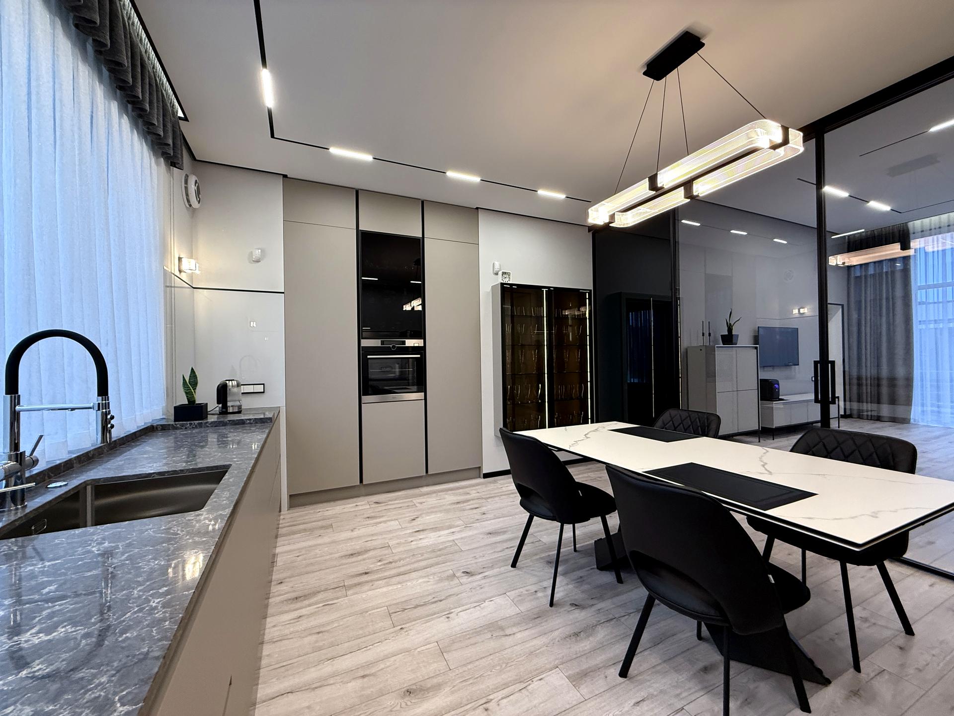- Кухня вбудована з новітніми технологіями, стільниця з натурального каменю, витяжка прихованого монтажу, найкраща фурнітура.