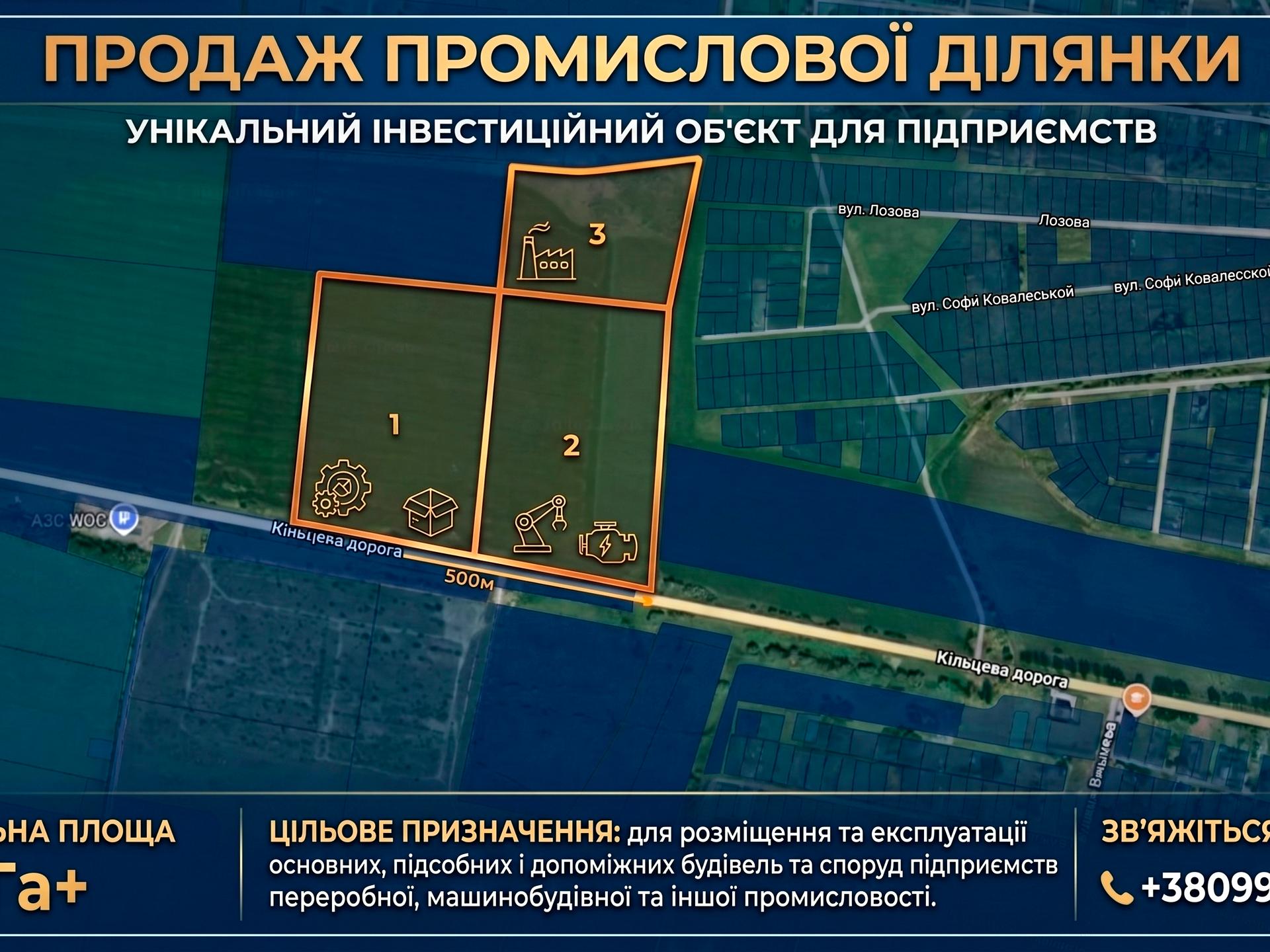 -Фасадна лінія: 500 метрів уздовж жвавої траси — ідеально для зручного заїзду фур та розміщення рекламних конструкцій.