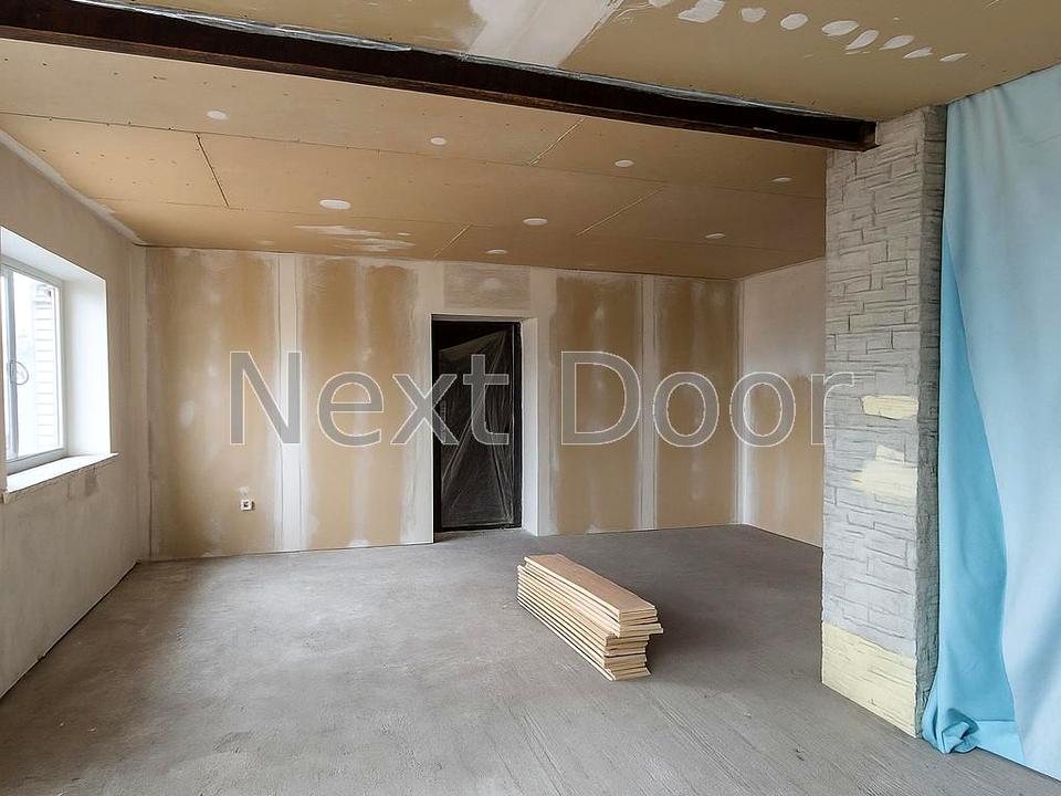 Побудован з ракушняка, обкладен білою цеглою, утеплений мінватою. Стіни обшиті гіпсокартоном.