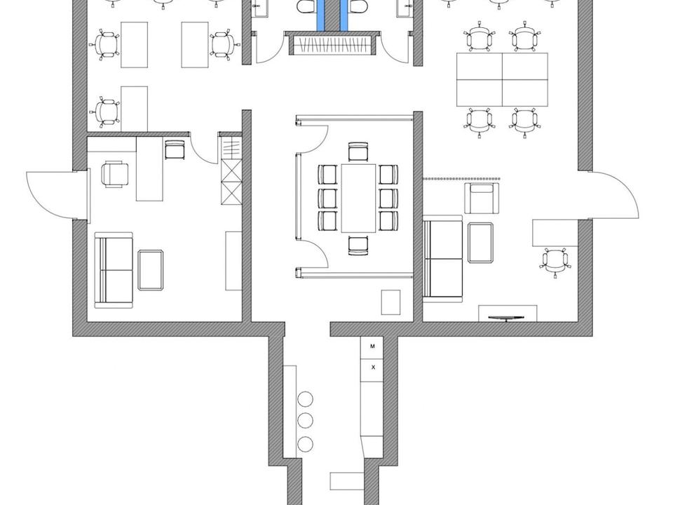 Планування: кабінет директора, переговорна кімната, 2 робочі кабінети (загалом 13 робочих місць, можна збільшити до 20)