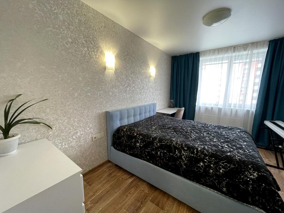 Простора двокімнатна квартира з роздільним плануванням, дві кімнати, в одній ліжко, в іншій кімнаті великий диван. З кухні вихід на балкон.