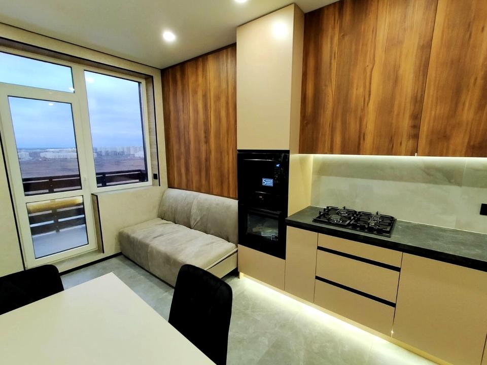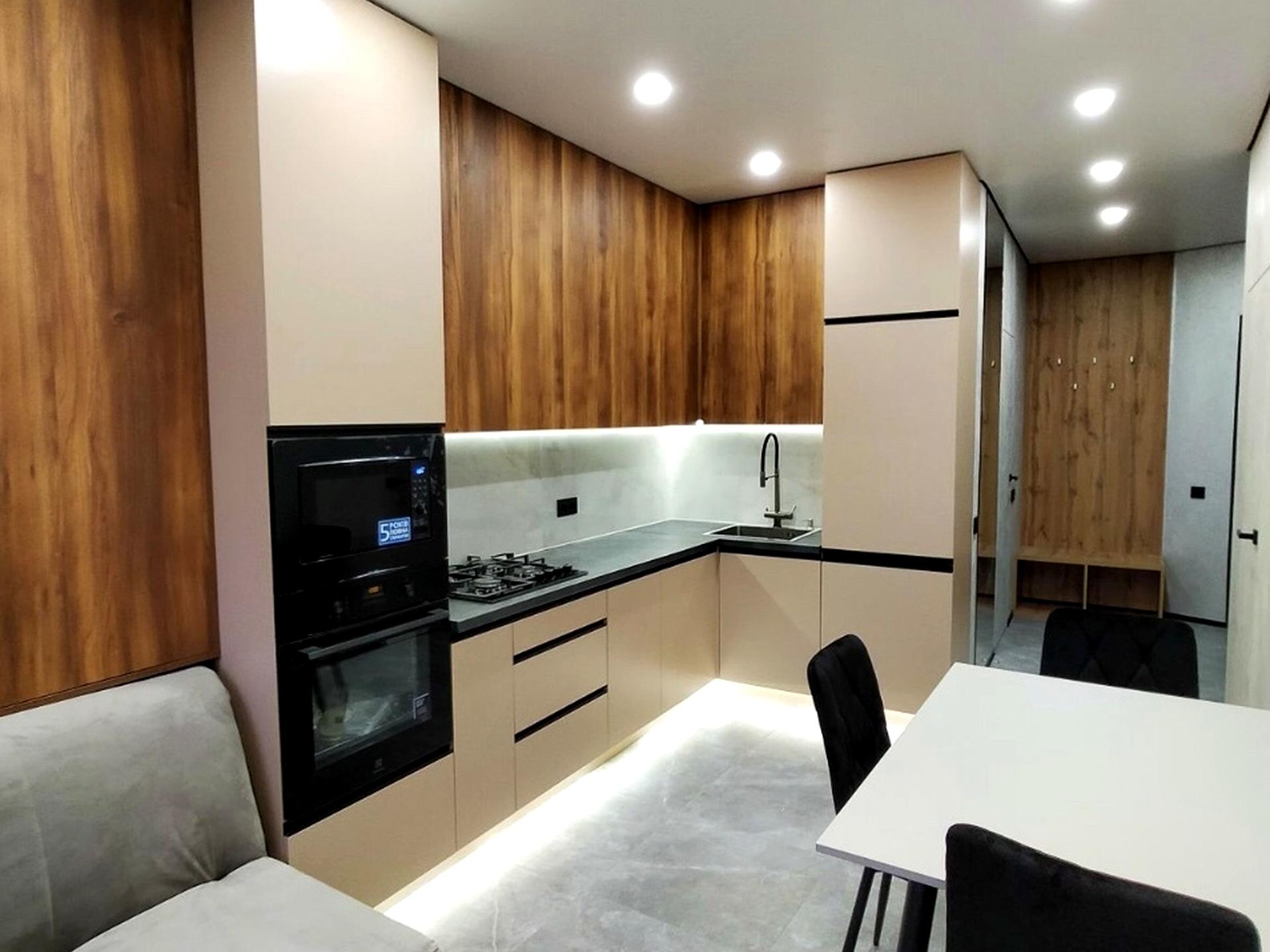 кухонний гарнітур, холодильник, духова шафа, посудомийна машина, витяжка, мікрохвильова піч, варильна поверхня, обідній стіл та 3 стільці.