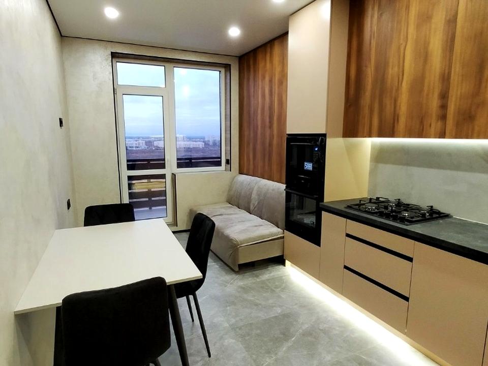 З кухні — вихід на балкон. Додатково встановлений розкладний диван, що дозволяє організувати ще одне спальне місце.