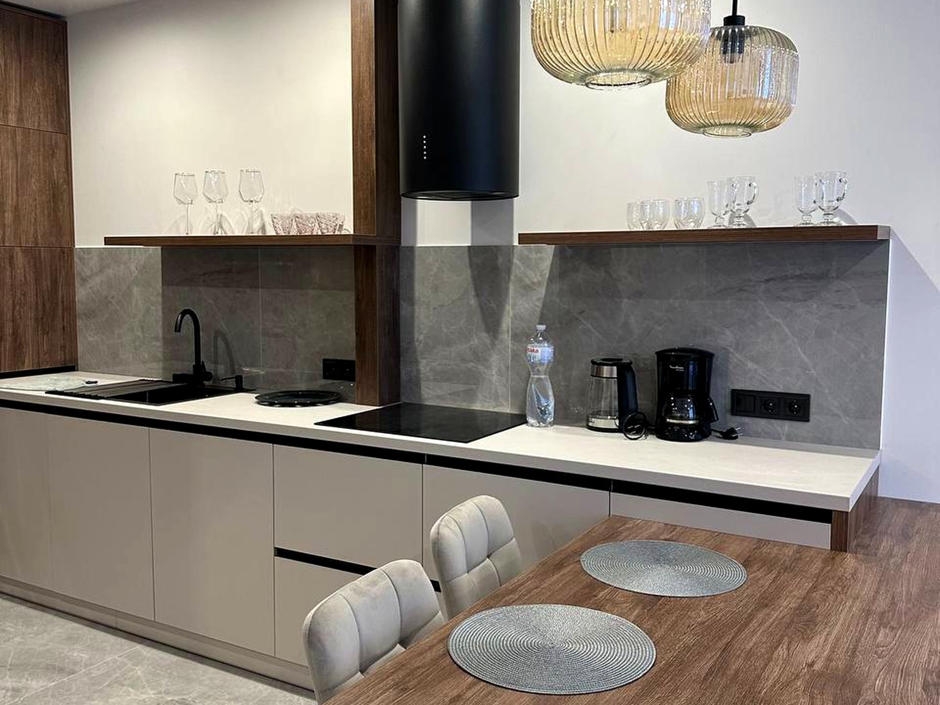 • Вбудована техніка преміум-класу: холодильник, прально-сушильна машина, мікрохвильова, духовка, посудомийка, індукційна плита, електрочайник, капсульна кавоварка