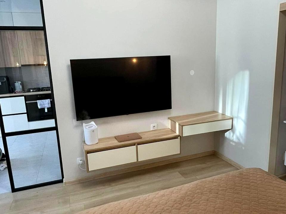 Кухня-студія, спальня, гардероб, санвузол ванна, технічне приміщення . В наявності вся побутова техніка посудомийка, кондиціонер,газова плита, духовка, мікрохвильова піч, холодильник, телевізор, пральна машинка та всі необхідні меблі для проживання інтернет-оптоволокно, тепла підлога в коридорі, санвузлі і на кухні.