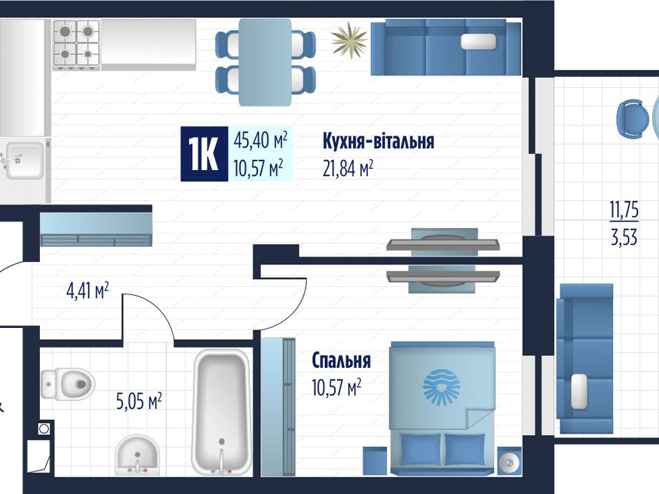 Загальна площа — 45.26 м², житлова — 10.53 м², кухня — 23.24 м².