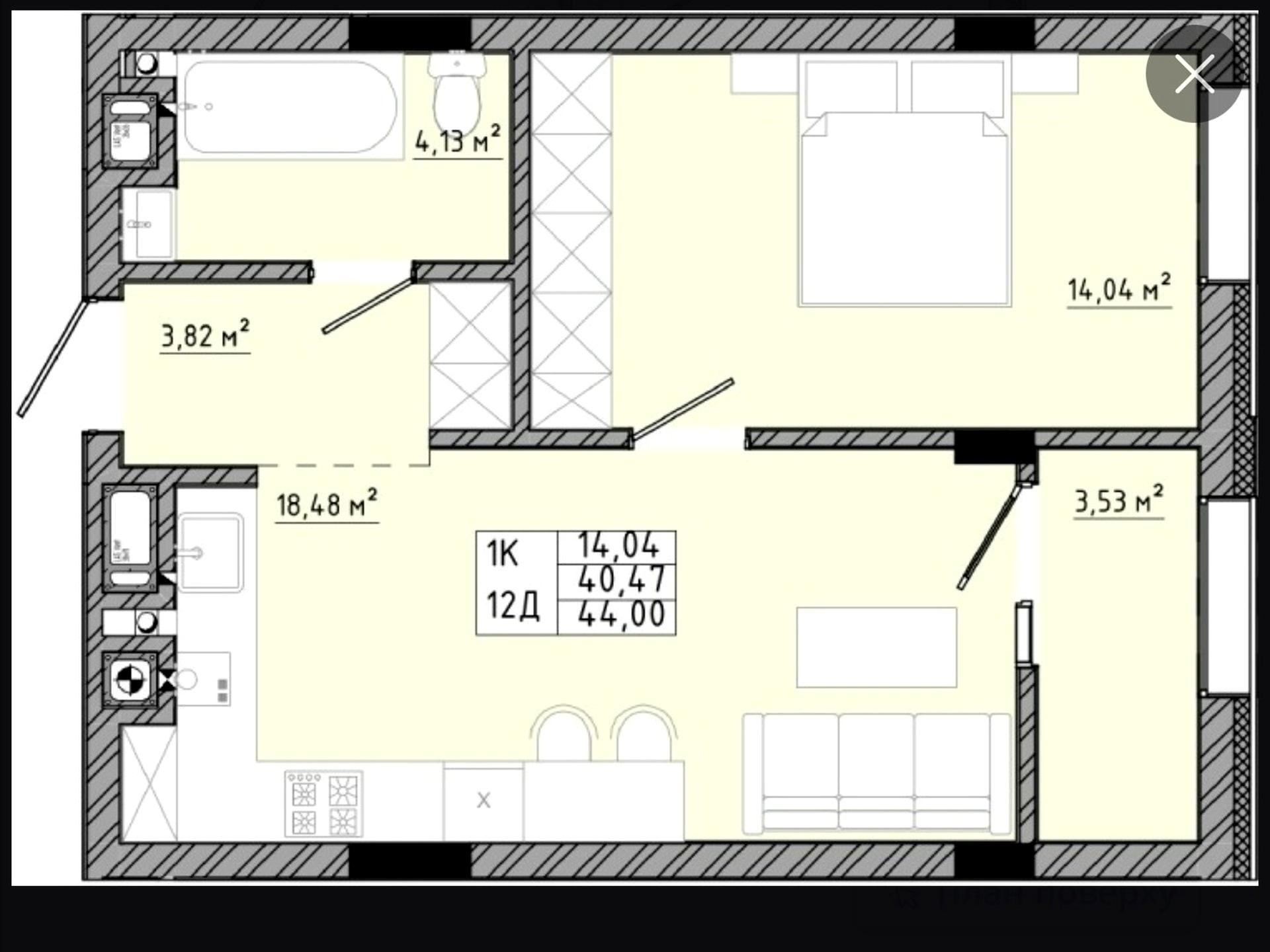 В квартирі 1 кімната, висота стелі 2.7 метра, Технологія будівництва - Монолітно-каркасна, Тип будинку - Спец. проект. Є газ. Будинок побудований в 2025 році. Загальний стан квартири - Без ремонту. Гаряча вода - газовий котел. Тип кухні - кухня-студія. Кількість спален: 1. Є підземний паркінг, доступний як укриття. Комісія за послуги 4 %