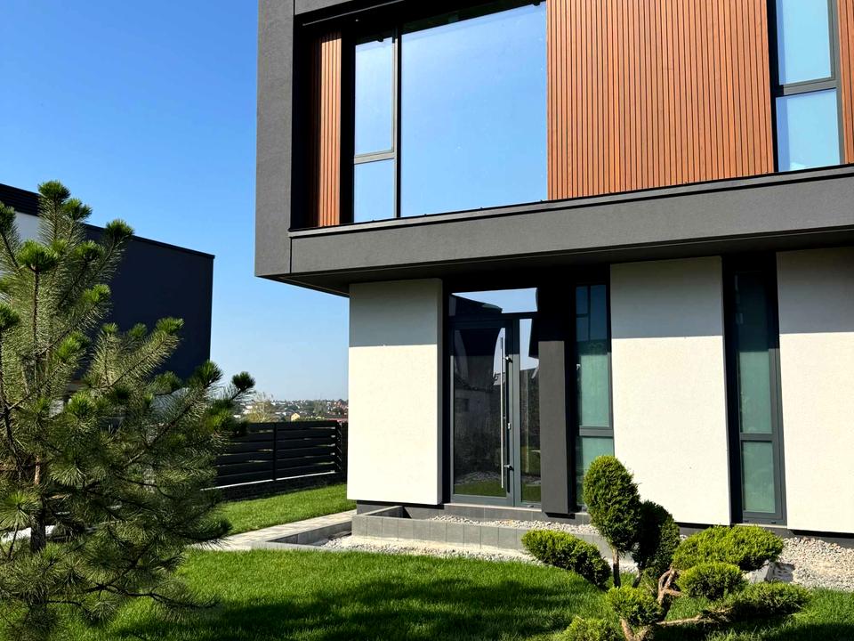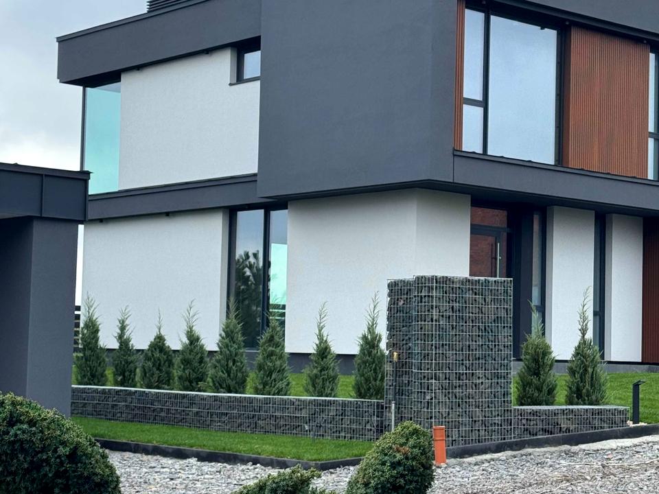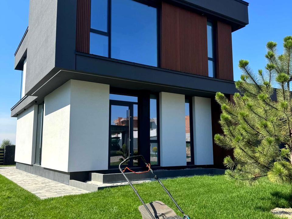 Будинок в 0-циклі, тобто ще без ремонту. Залита цементна стяжка на підлозі, поштукатурені стіни, встановлені алюмінієві вікна Reynaers, вхідні двері. Будинок зовні утеплений пінопластом 15 см. Фасадна, терасна дошки - термоясен.