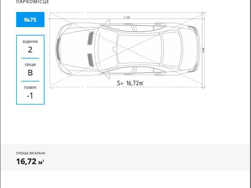 Паркомісце на паркінгу. Тип паркінгу: підземний. Під легкове авто. Площа 16.72кв. м. Кількість машиномісць: 1. Без комісії
