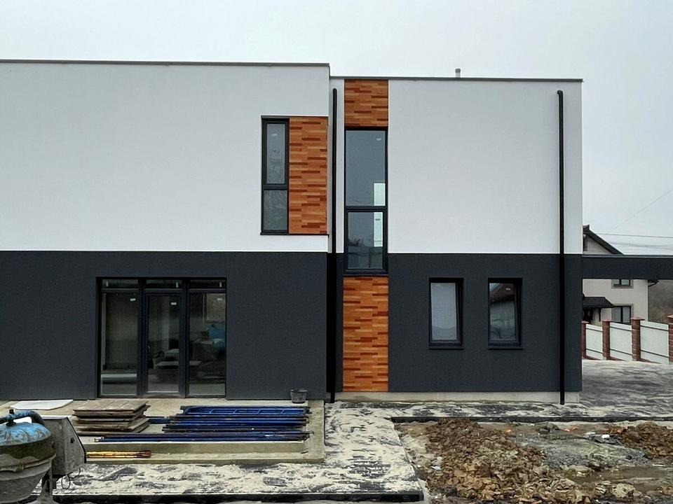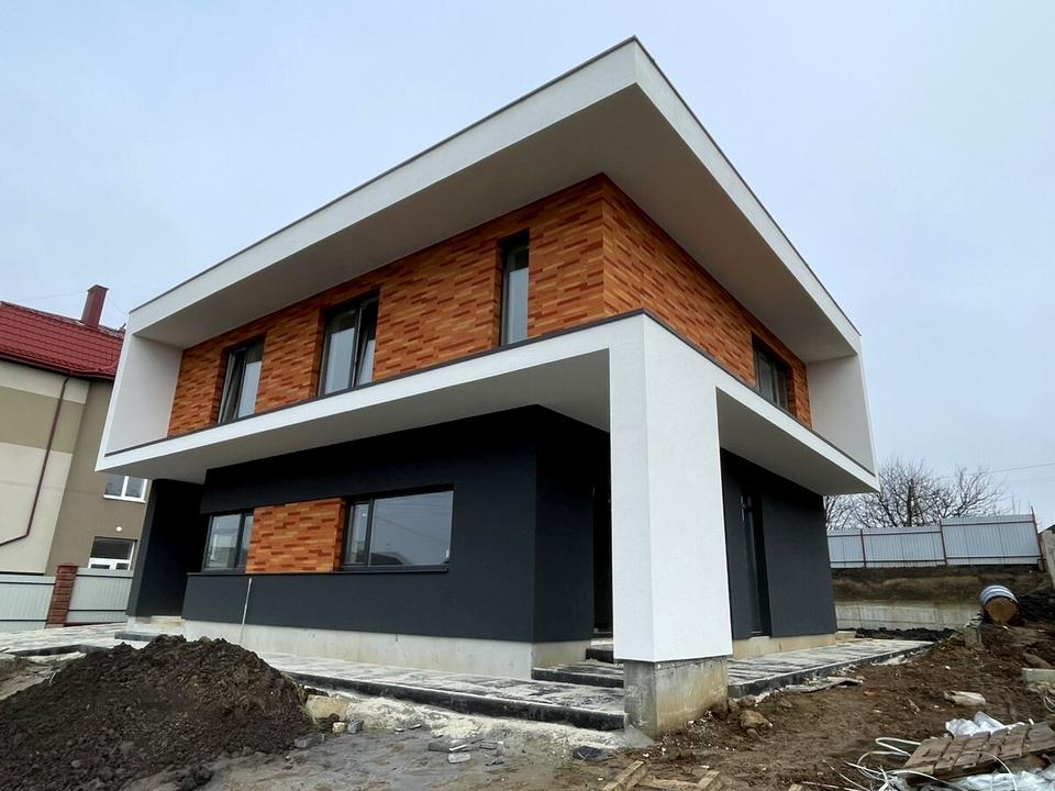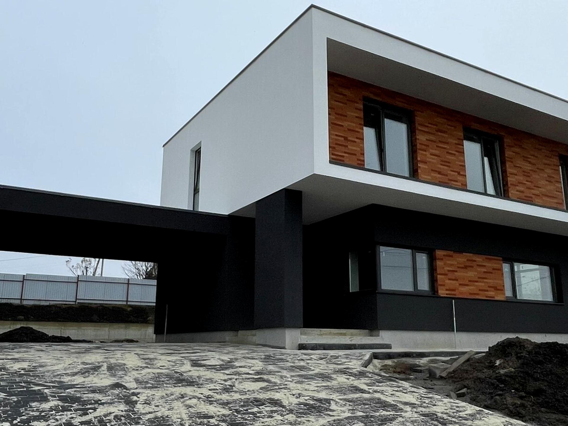 Стіни з газобетону 375 мм. Фундамент - стрічковийПерекриття - монолітна плита 15 см Фасад утеплений пінопластом 10 смДах покритий ПВХ-мембраною. Внутрішнє оздоблення стін - гіпсова штукатурка.Територія викладене бруківкою.