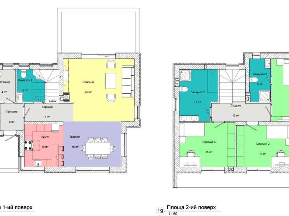 Планування будинку:Перший поверх: простора кухня-вітальня з виходом на терасу, санвузол та котельня. Другий поверх – три ізольовані кімнати, санвузол (дві з балконами і одна з власним санвузлом та гардеробною) .Є затишна тераса для відпочинку та автомобільний навіс на 2 машини.