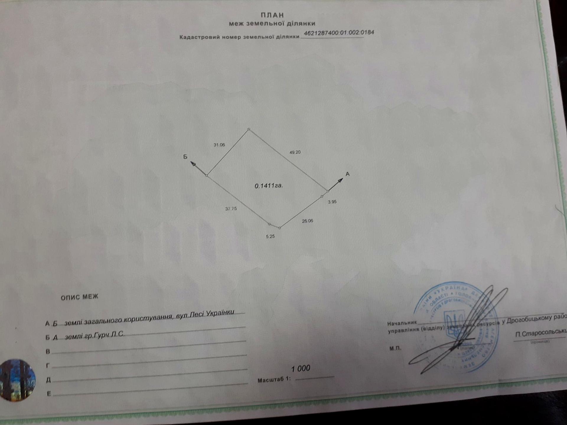 Продається земельна ділянка площею 0.1408 га у с. Станиля, Дрогобицький район, вул. Лесі Українки, 22.