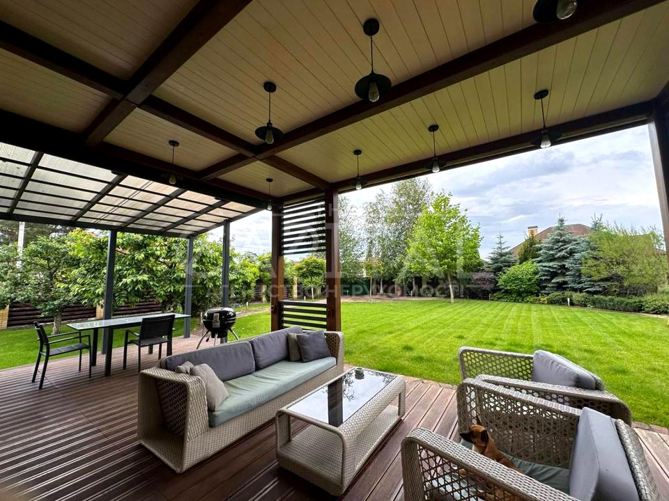Площа будинку — 350 м², земельна ділянка — 15 соток із професійним озелененням. Є гараж із зарядною станцією для електромобіля (32А, 7 кВт) та додатково два місця для паркування машин.