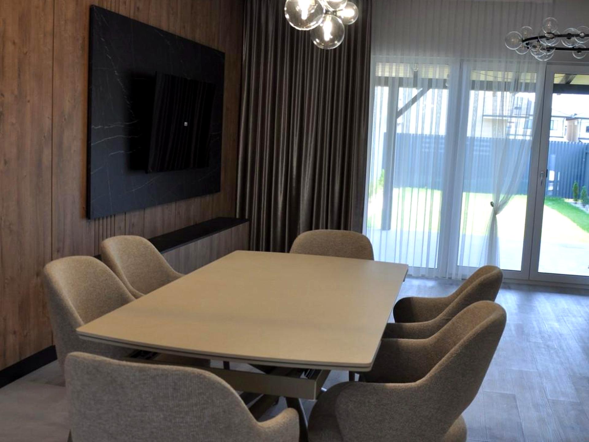 Раціональне планування, простора кухня-вітальня, якісні оздоблювальні матеріали.