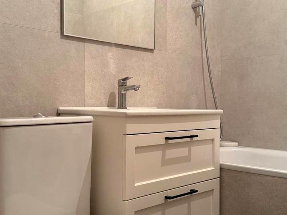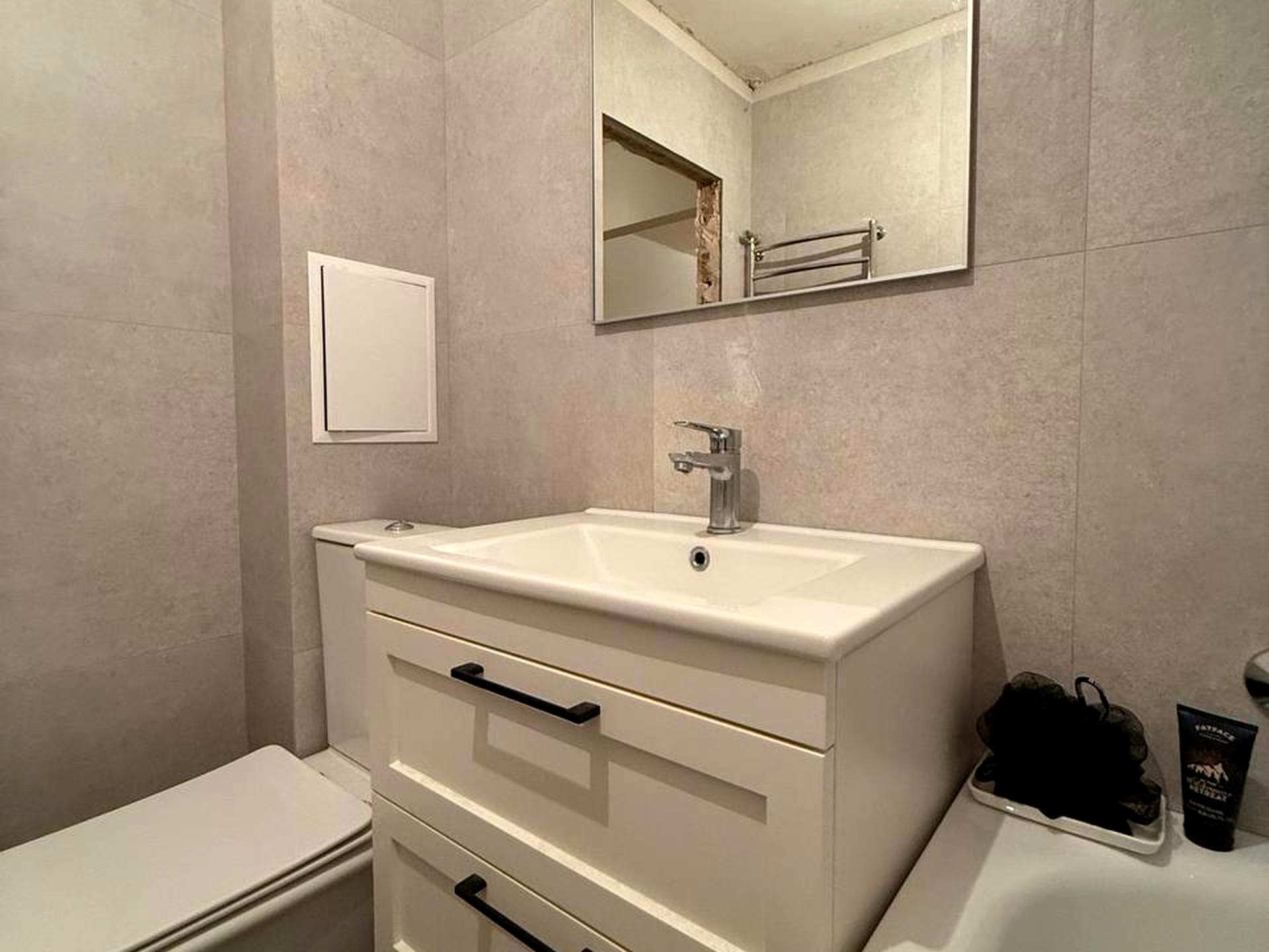 Санвузол виконаний у сучасному стилі з використанням світлої керамічної плитки