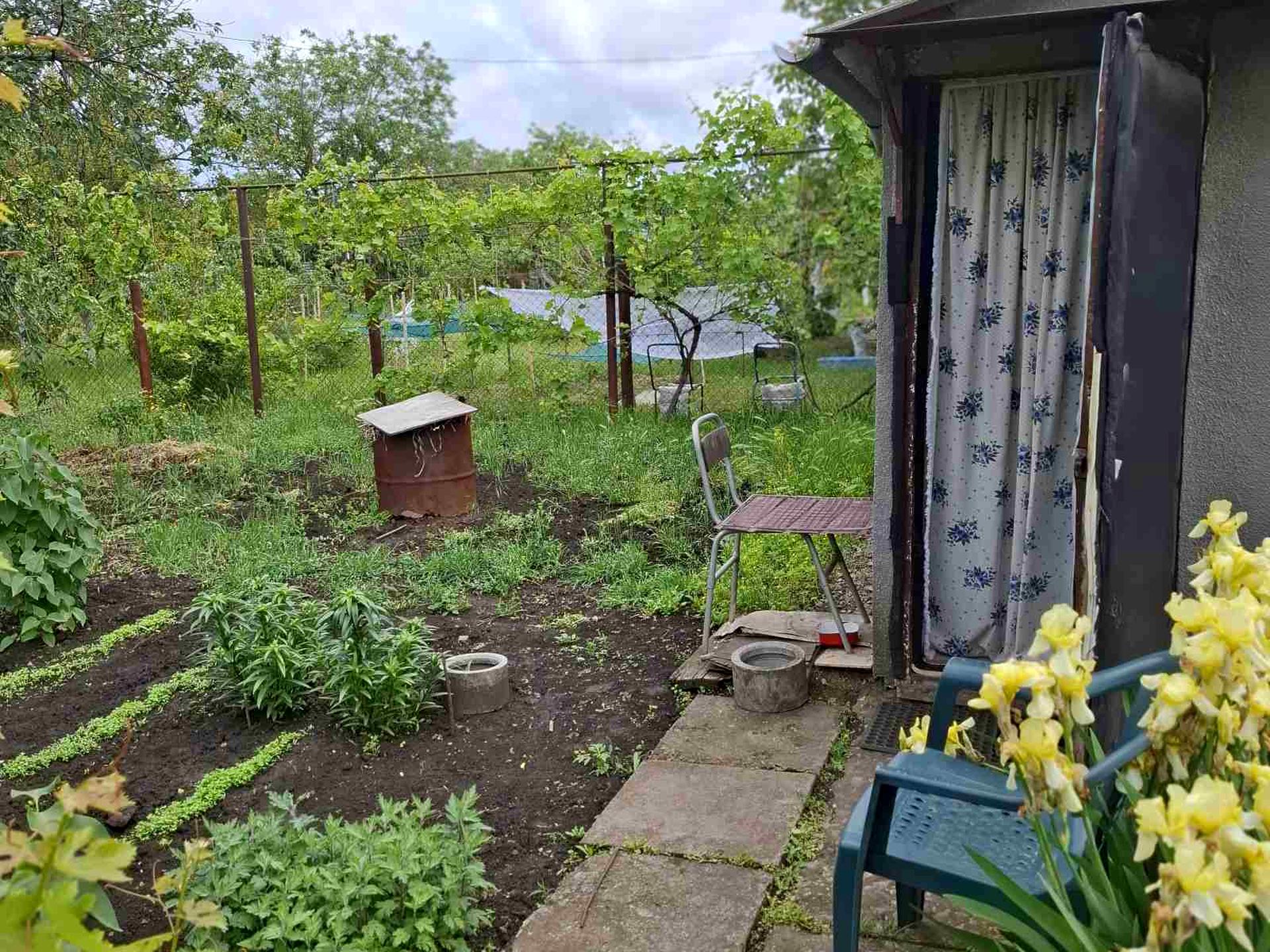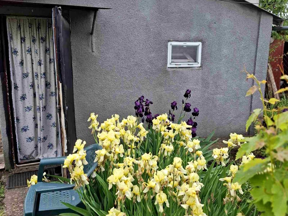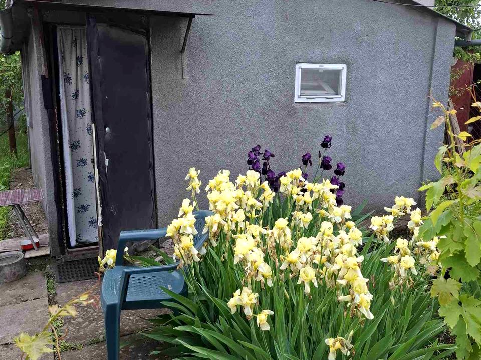 Есть маленький домик на две комнаты и кухню, печное отопление,Туалет, душ, летняя кухня