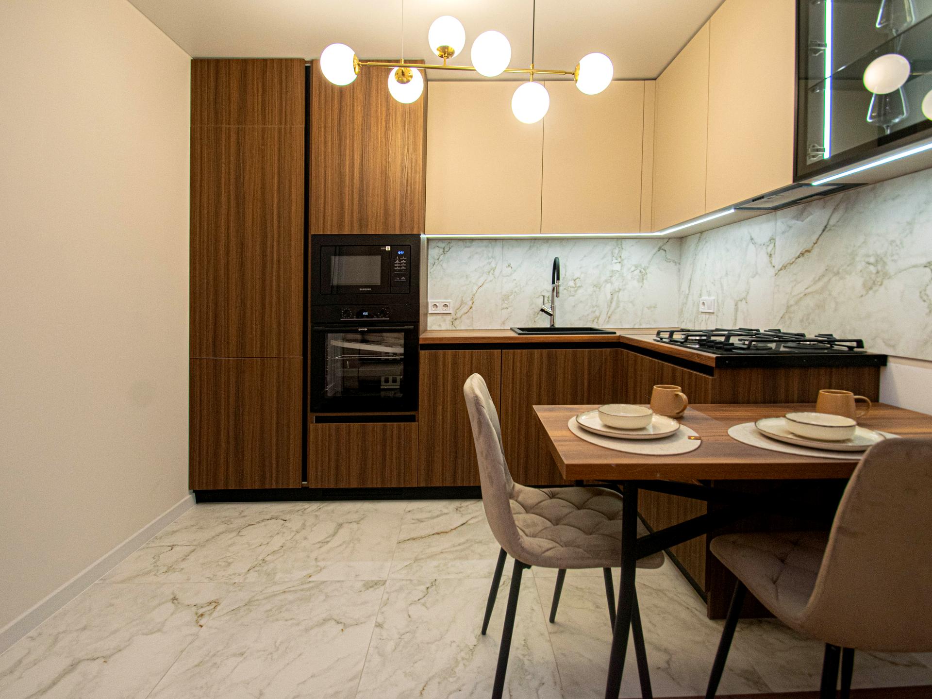Кухня обладнана необхідною технікою. У компактній ванній кімнаті є пральна машина та душова кабіна.
