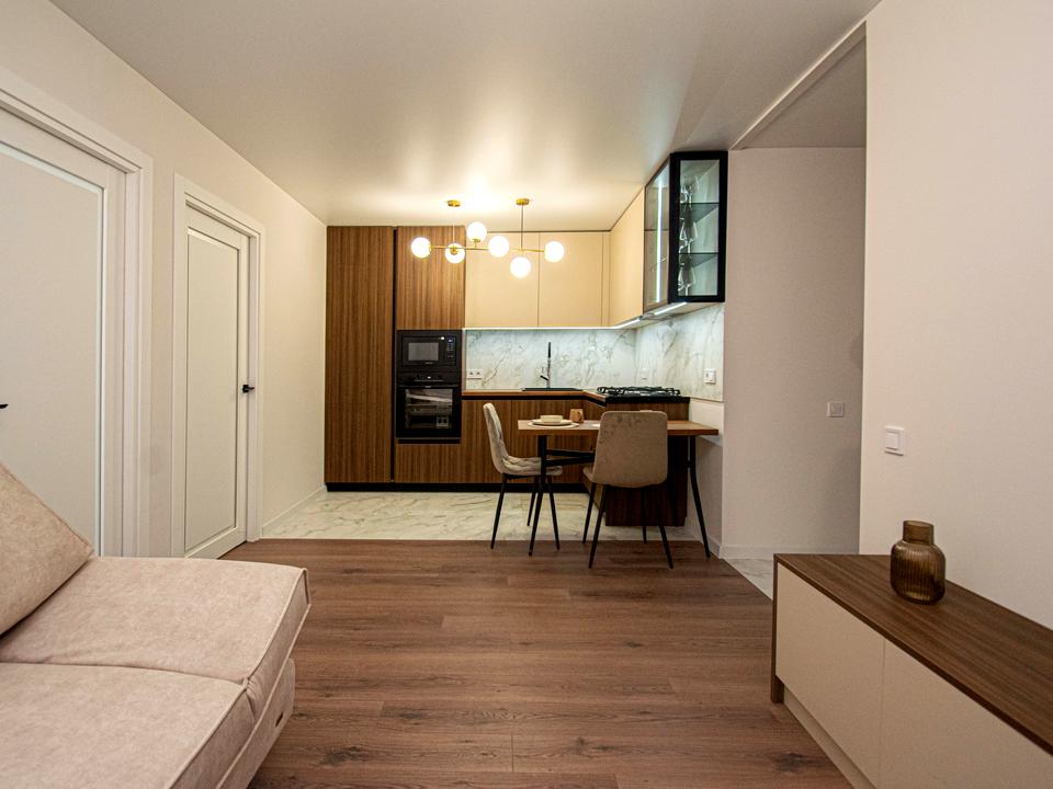 Компактна квартира у затишному районі міста. Вітальня вдало розділена на зони для відпочинку та для зустрічей з гістьми.