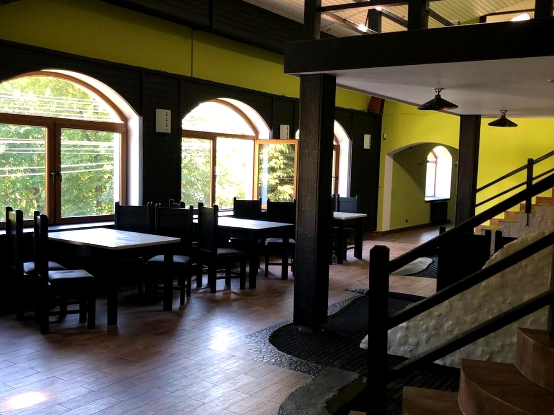 На першому поверсі - просторий зал, кухня, мангальна зона з діючим мангалом, технічні приміщення, кабінети.
