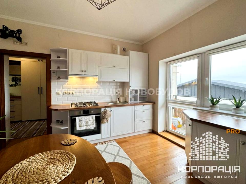 На кухні вбудовані меблі та техніка (варильна поверхня, духова шафа, холодильник. мікрохвильовка). Обідній стіл та меблевий куток.