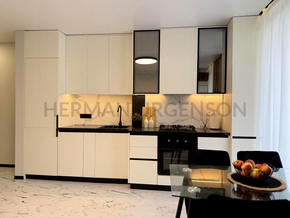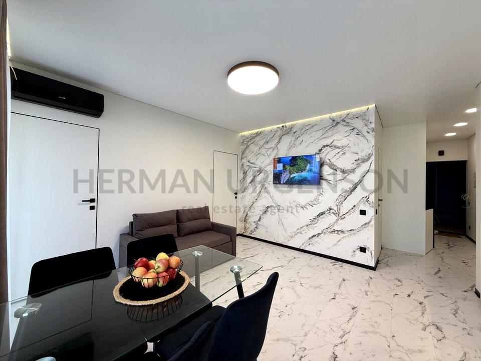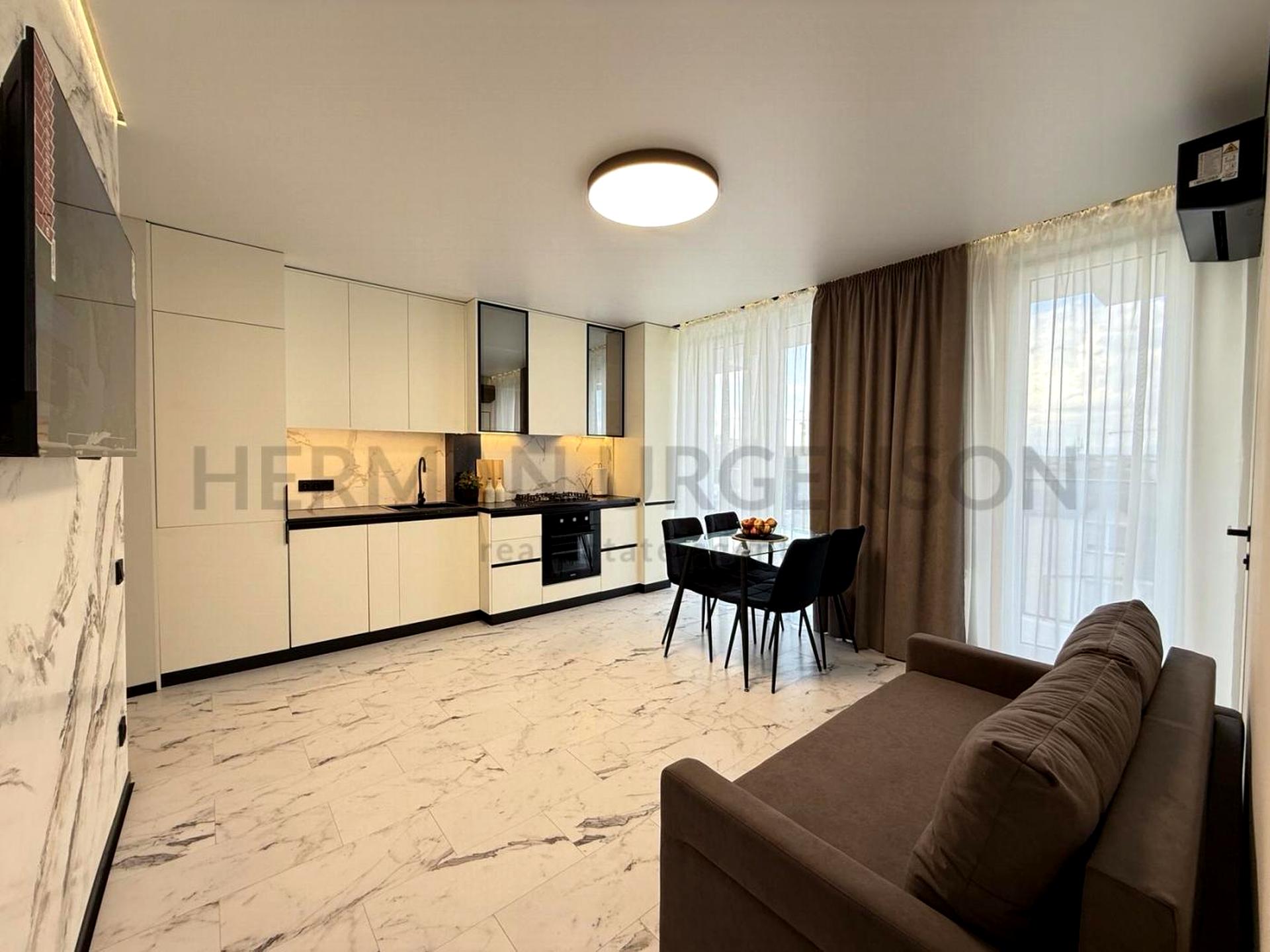 В квартирі виконано сучасний ремонт. Панорамне скління забезпечує максимальну кількість природного світла, що робить квартиру ще більш затишною та світлою. Обладнана побутовою технікою, необхідною для комфортного проживання: варильна поверхня, духова шафа, витяжка, холодильник, кондиціонер, телевізори. Ванна кімната обладнана усім необхідним: встановлена ванна, унітаз та умивальник.