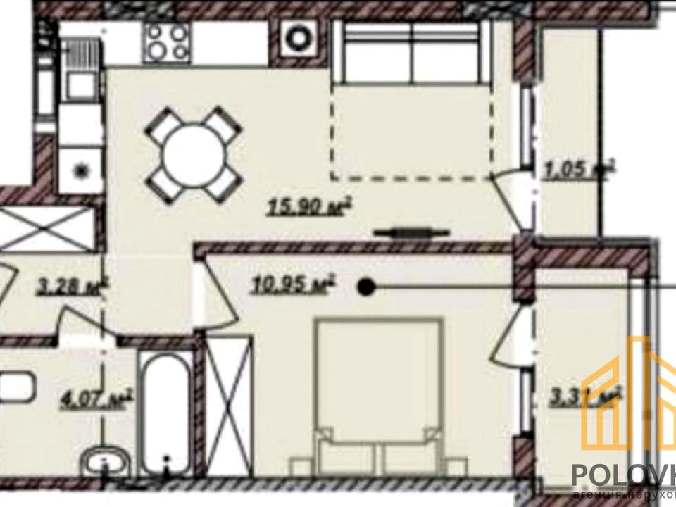 В квартирі 1 кімната, Тип будинку - Спец. проект. Є газ. Є 2 балкони. Загальний стан квартири - Без ремонту. Кількість санвузлів: 1. Тип кухні - кухня-студія. Кількість спален: 1. Комісія за послуги 2 %
