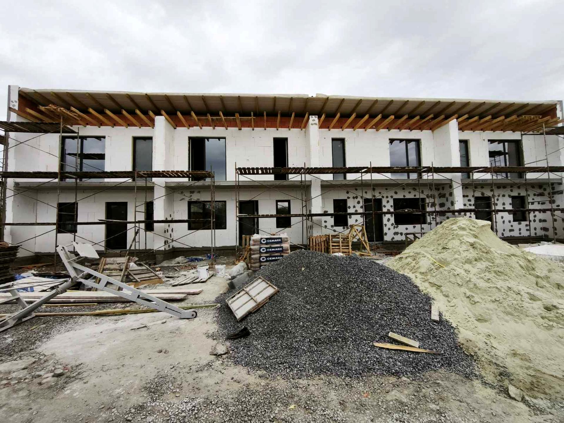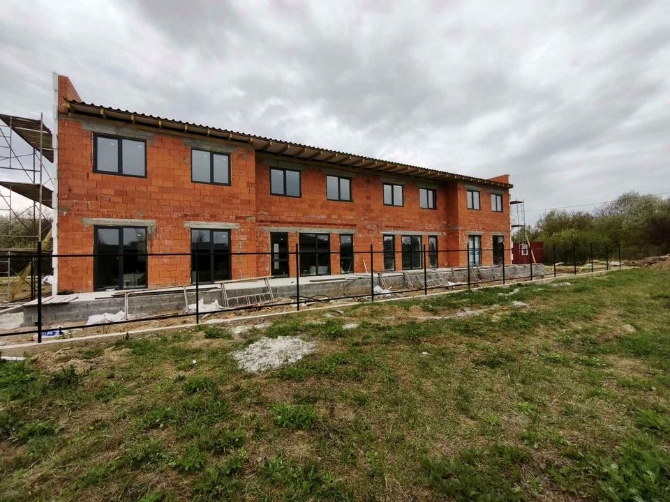 – Зовні котеджі будуються з цегли + утеплений 10 пінопластом, дах утеплений-односкатний – покритий фальцевою покрівлею, вікна шестикамерні, якісні вхідні двері.