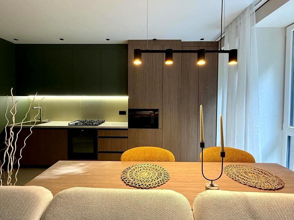Вся техніка на кухні вбудована: варильна панель з посиленою конфоркою WOK, духова шафа з грилем і самоочищенням парою, мікрохвильова піч зі спец.функціями приготування, повнорозмірна посудомийна машина з ефективною сушкою посуду повітрям, прально-сушильна машина з дистанційним керуванням, холодильник з системою No Frost, повно вбудована витяжка.