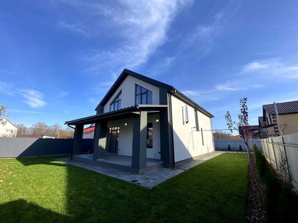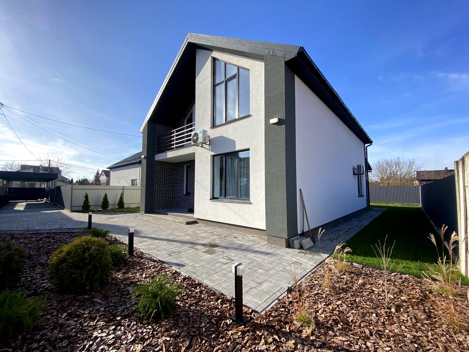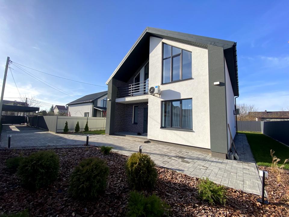 Сучасний двоповерховий будинок приваблює стильним фасадом та гармонійною архітектурою. У середині — дизайнерський ремонт, продумане планування та повністю облаштована кухня з технікою. Ззовні — простора тераса, доглянутий газон, благоустрій території й автоматичні ворота для зручності.