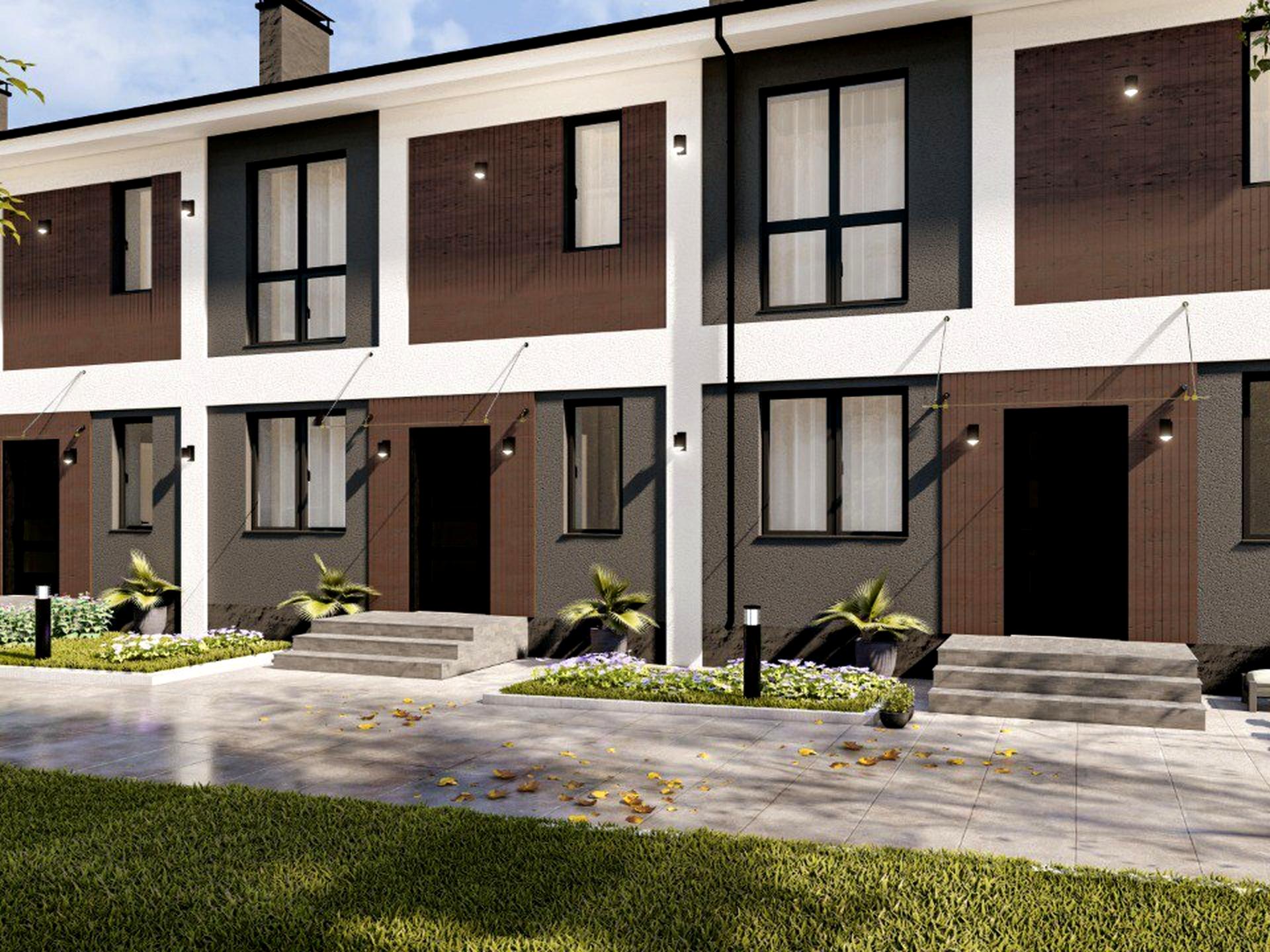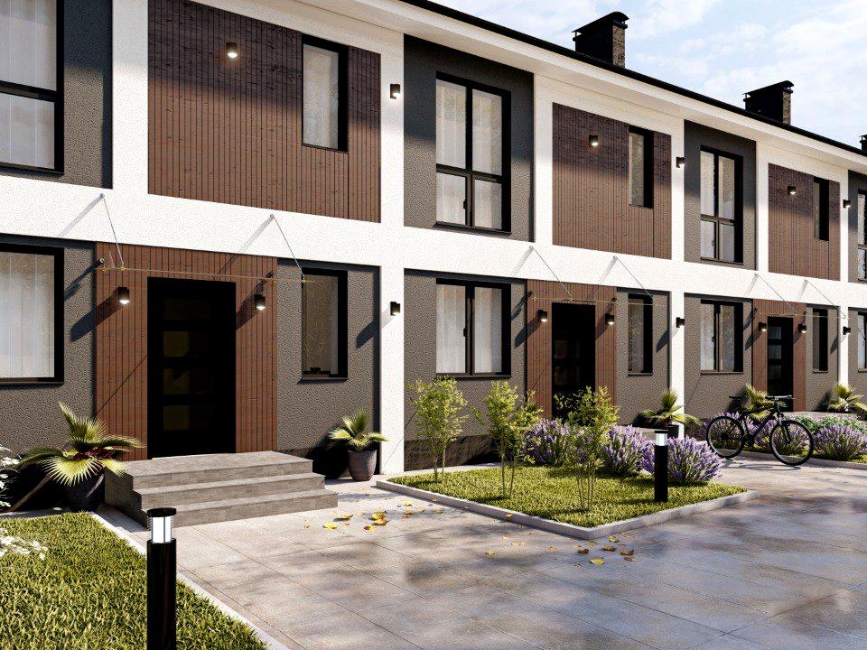 Наразі таунхаус побудований, тривають внутрішні роботи та оздоблення фасаду.
