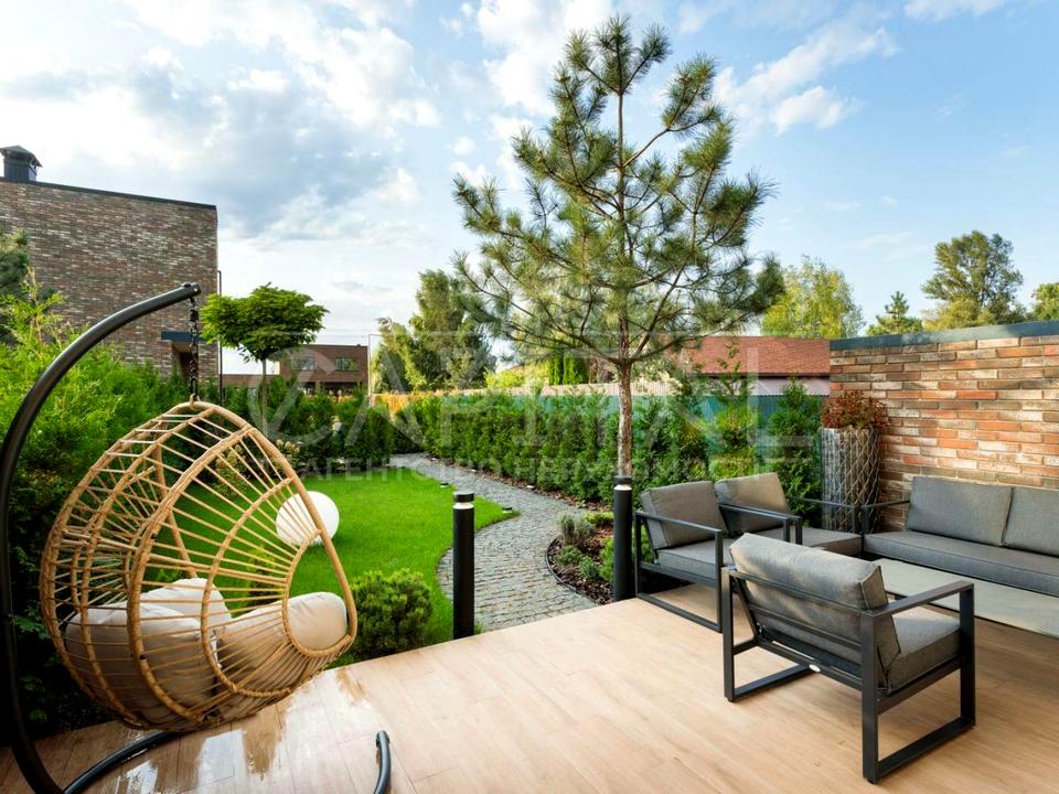 Задній двір з ландшафтним дизайном облаштований системою автоматичного поливу, двома терасами, автоматичною маркізою. Є два паркомісця.