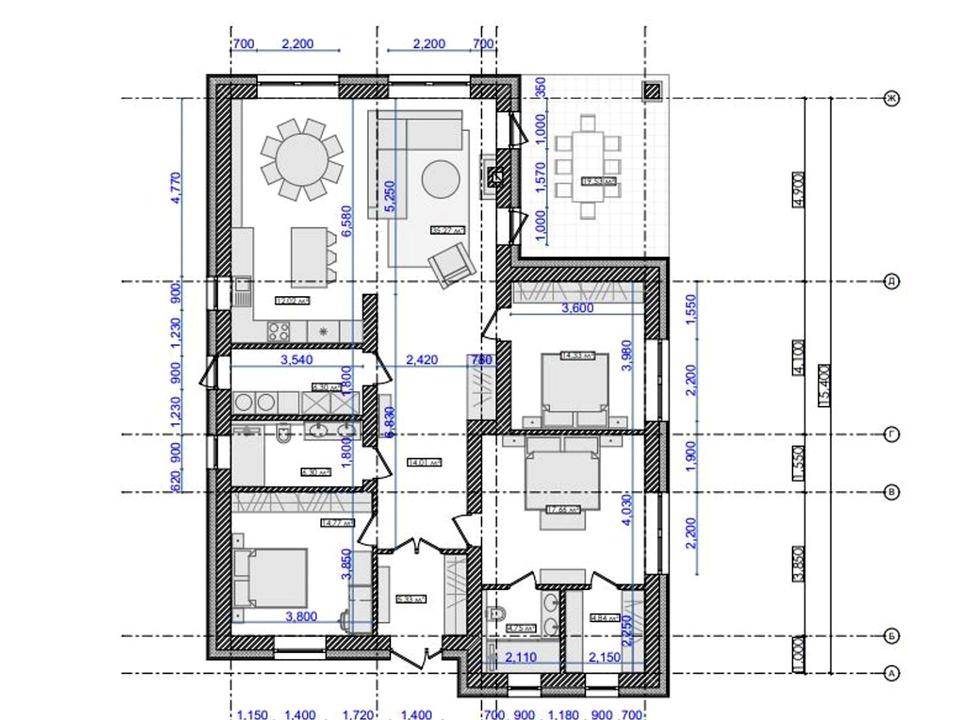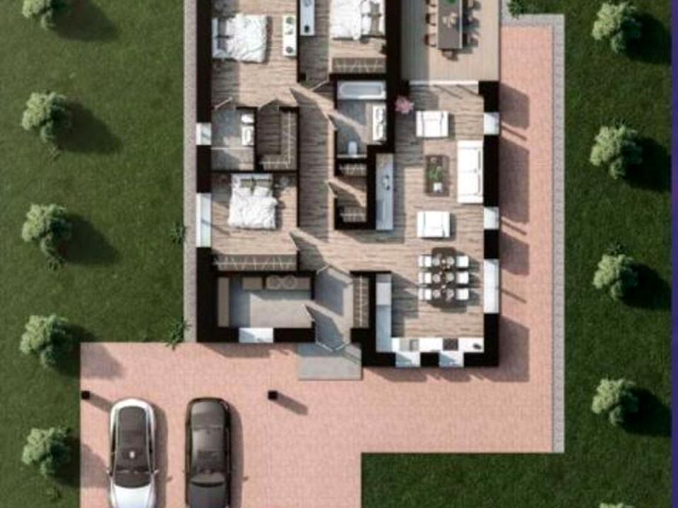 Площа опалювана – 136 м.кв. Три варіанти планування, навіс для 2 авто, крита тераса, електрика - 10 квт з можливістю збільшення, септик, газ по вулиці, скважина. В будинку буде виконана гіпсова штукатрука, по периметру участка висаджені туї.